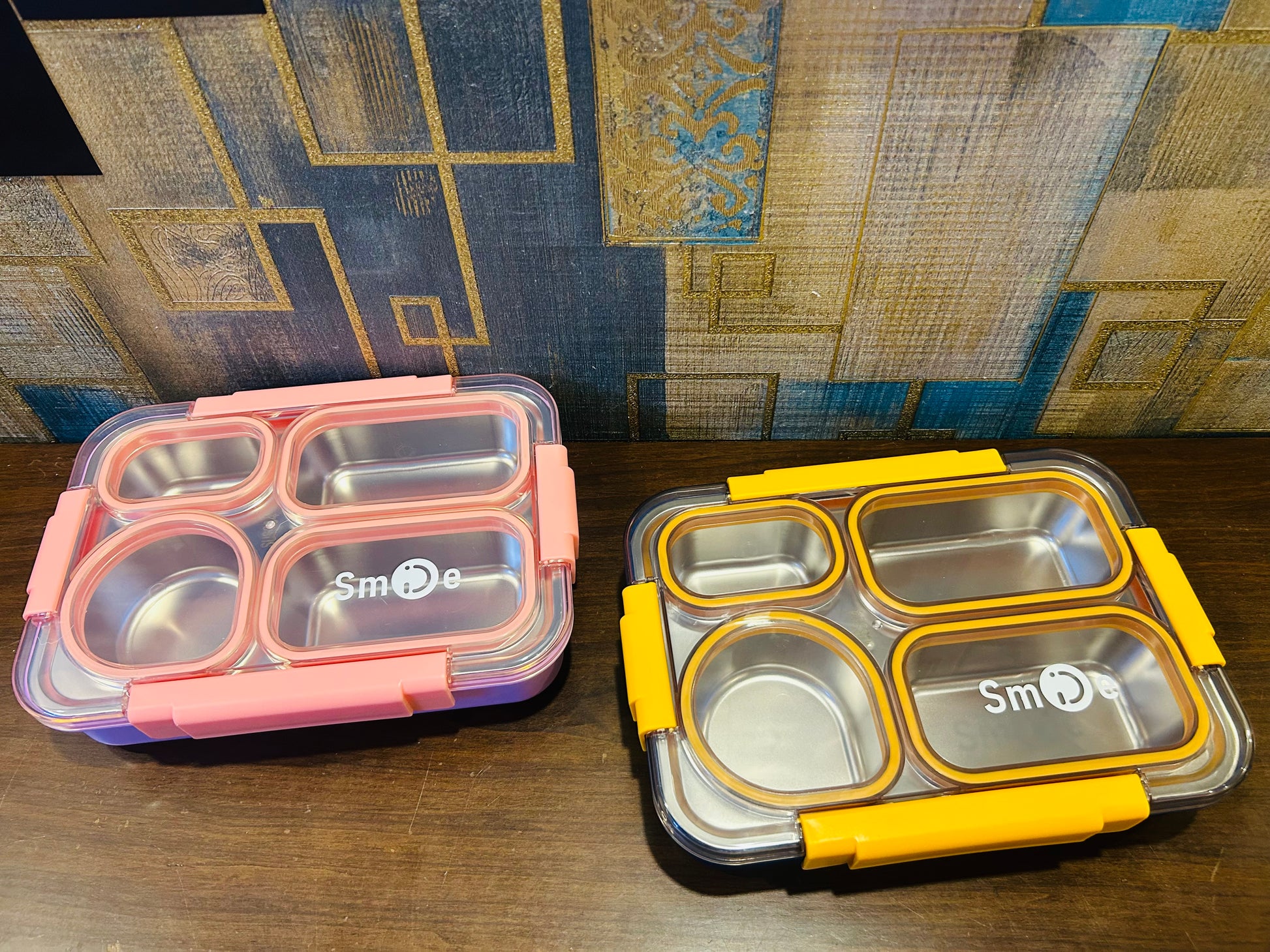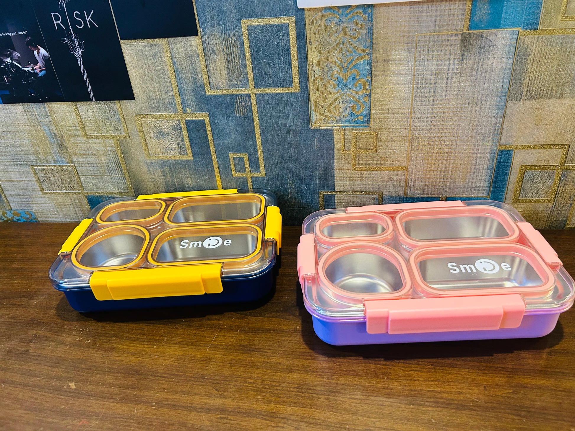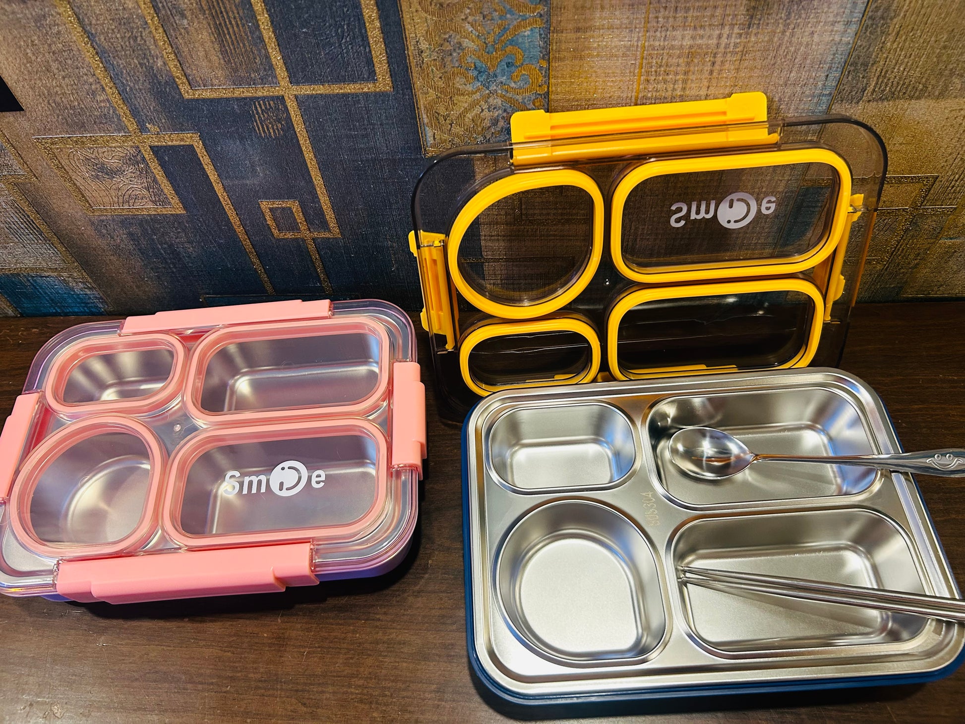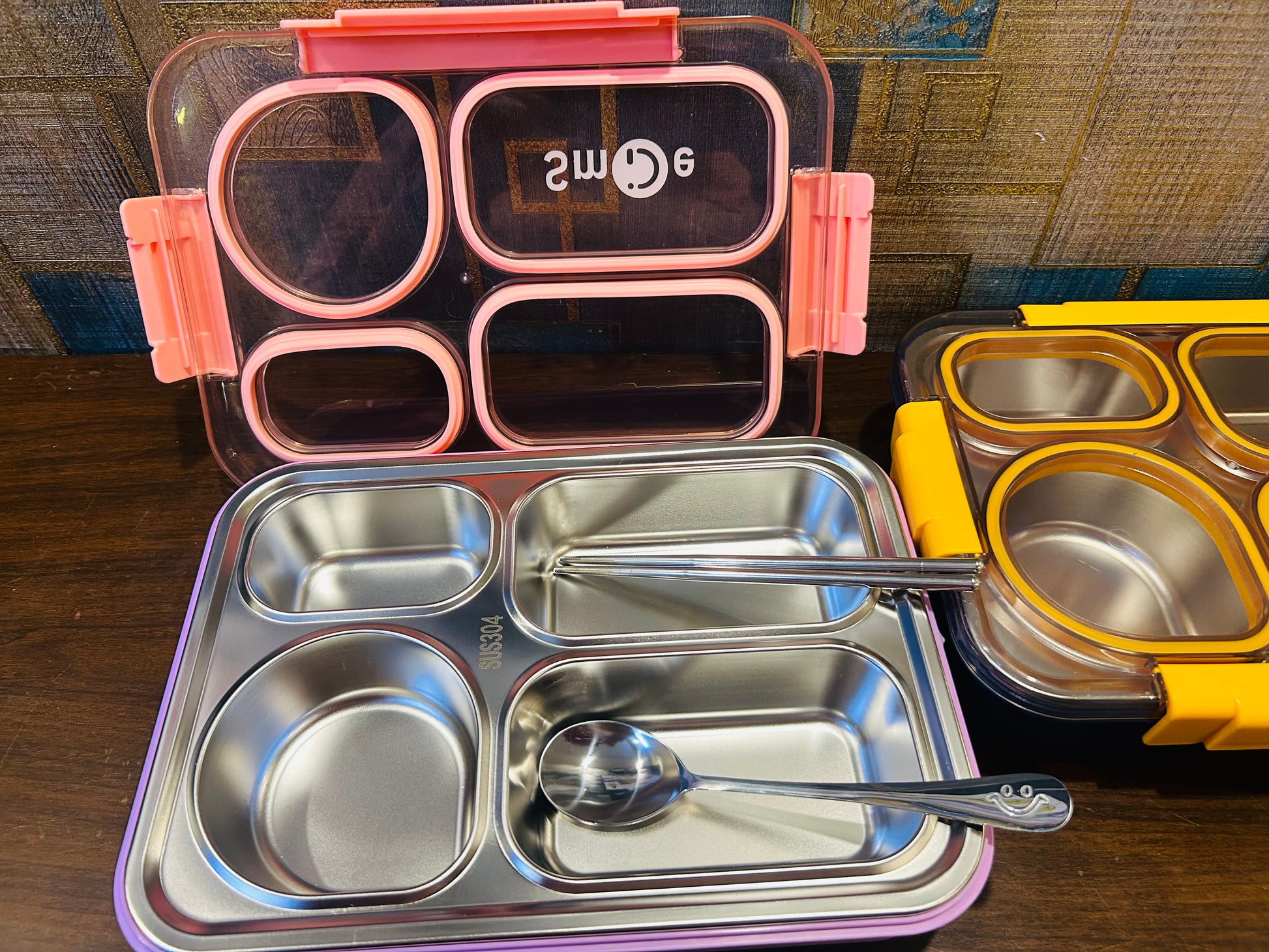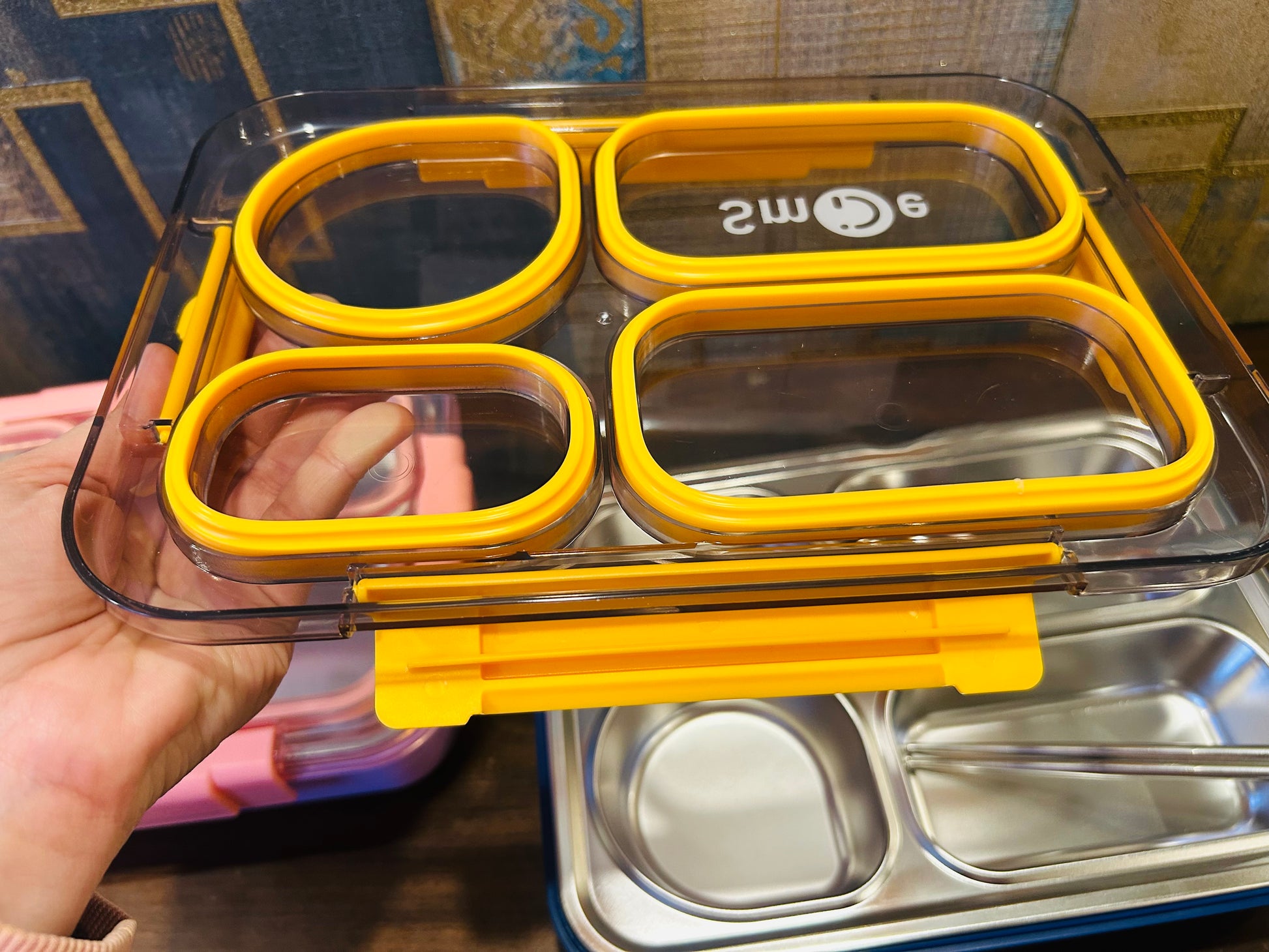 4 Grid Lunch Box with every grid sealed, four side lock design, 1 Pair of Tableware, Breathable Button Design and Heatable water insulation.