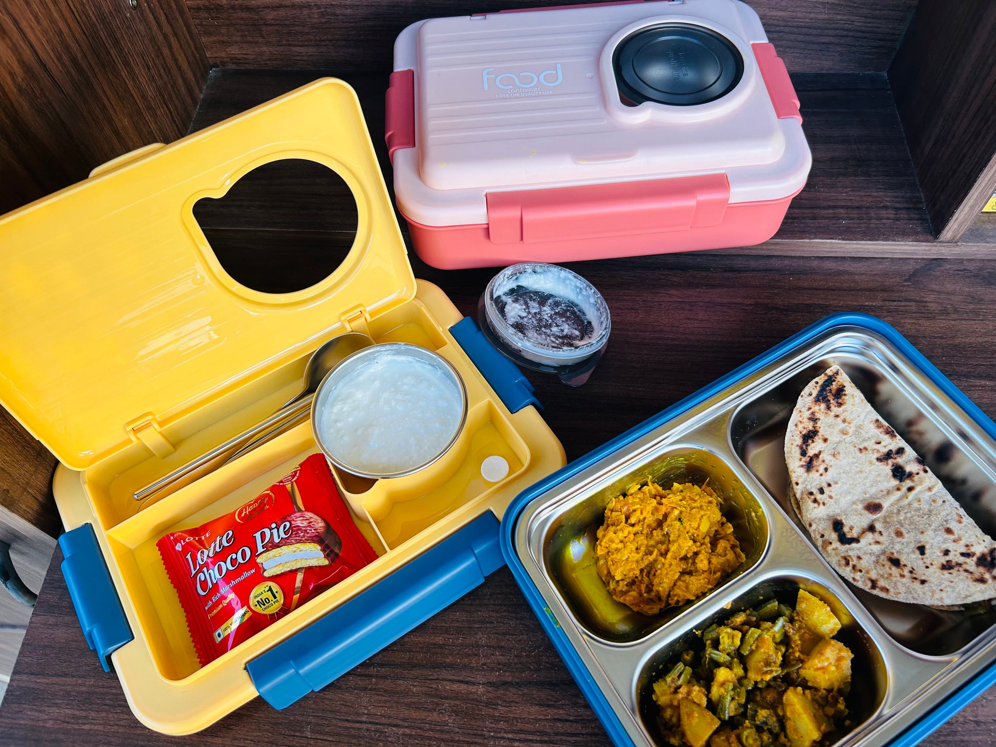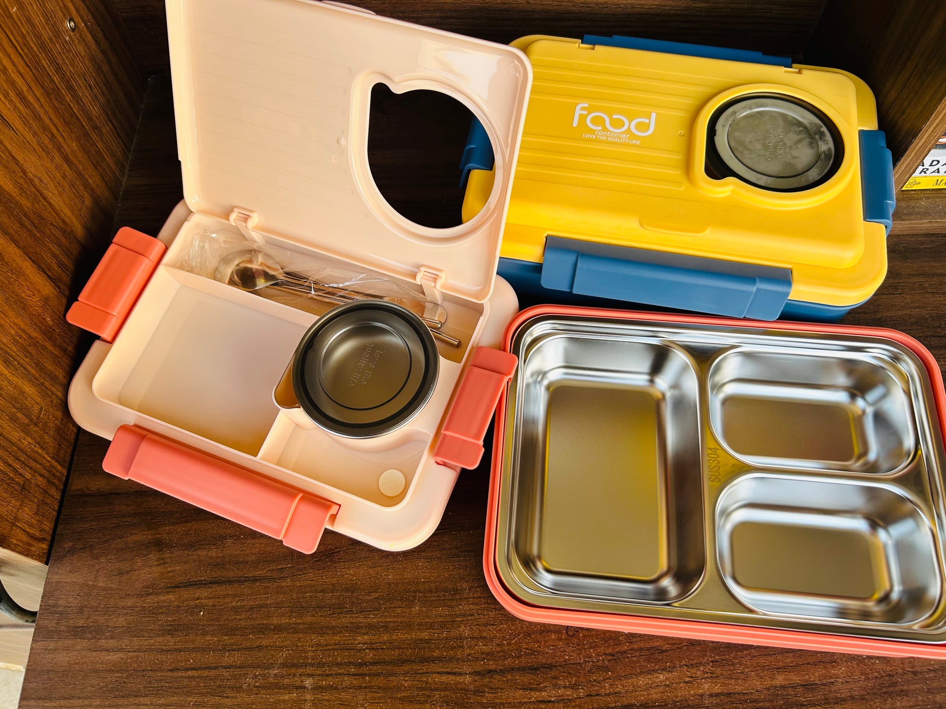 Stainless Steel Tiffin Box comes with one pair of cutlery, leakproof soup/curd bowl, four sided lock with seamless design of sealing which makes it 100% leakproof.