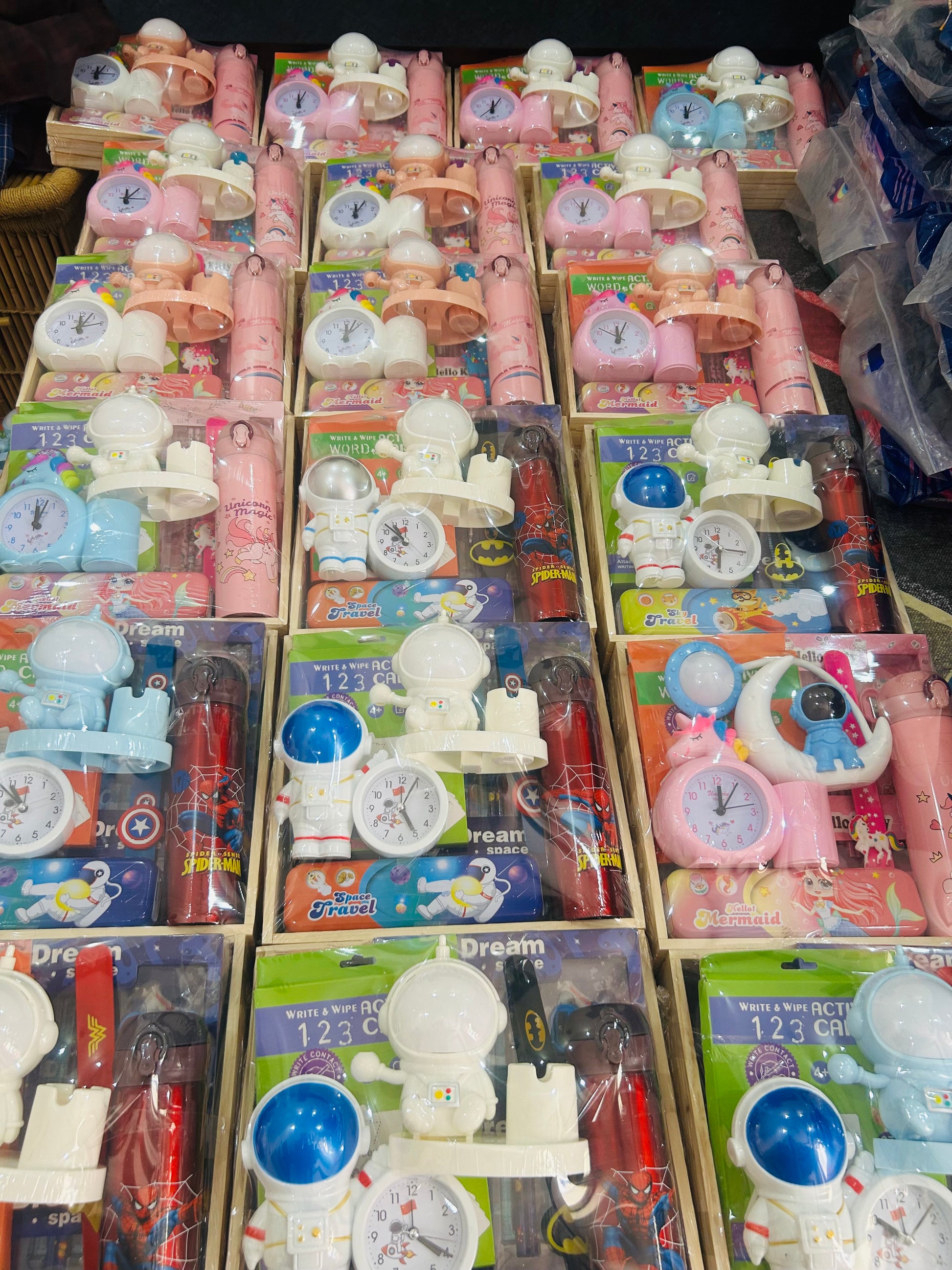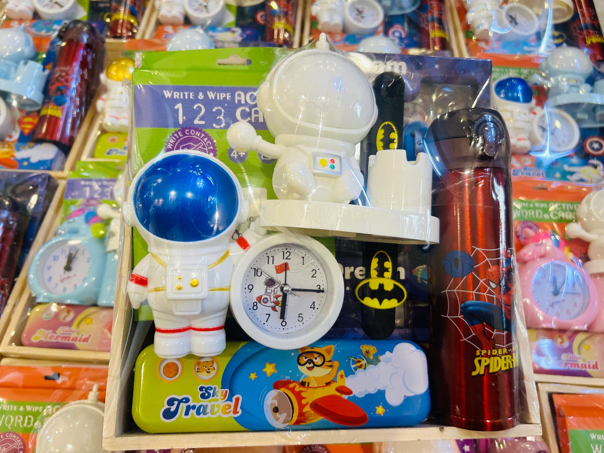 Includes- Stationery Set, Alarm Clock, Lamp, Moving Pencil Box, Educational Activity Cards, Slapped Band and Insulated Flasks.