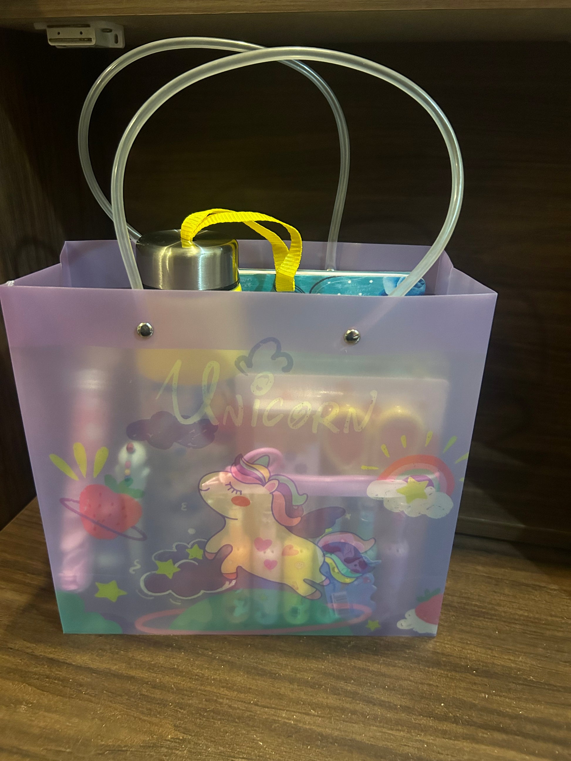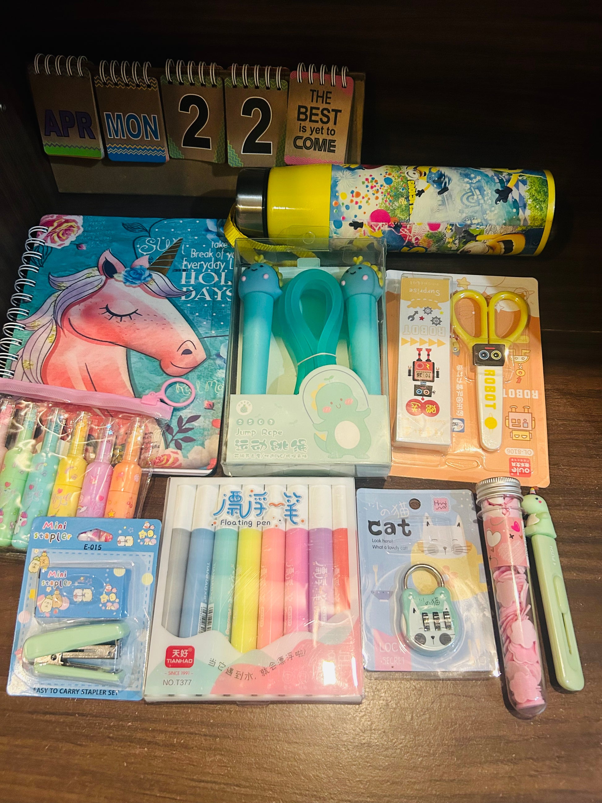 This Combo includes: Return Gift Bag, Minion Insulated Flask 500ml, Mini Stapler, Paper Cutter, Jumping Rope, Spiral Pad, Paper Soap, Password Lock, Highlighters Pack,Floating Pens Set and Scissor.