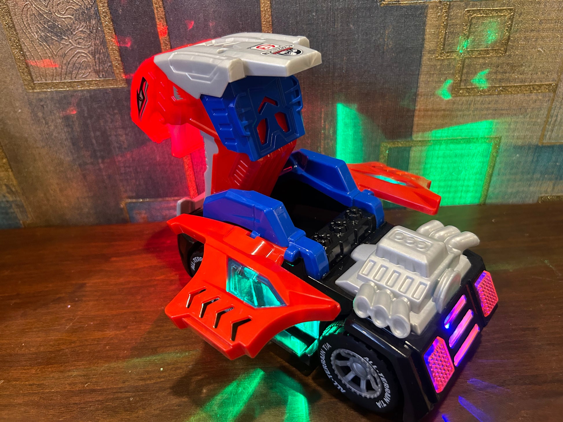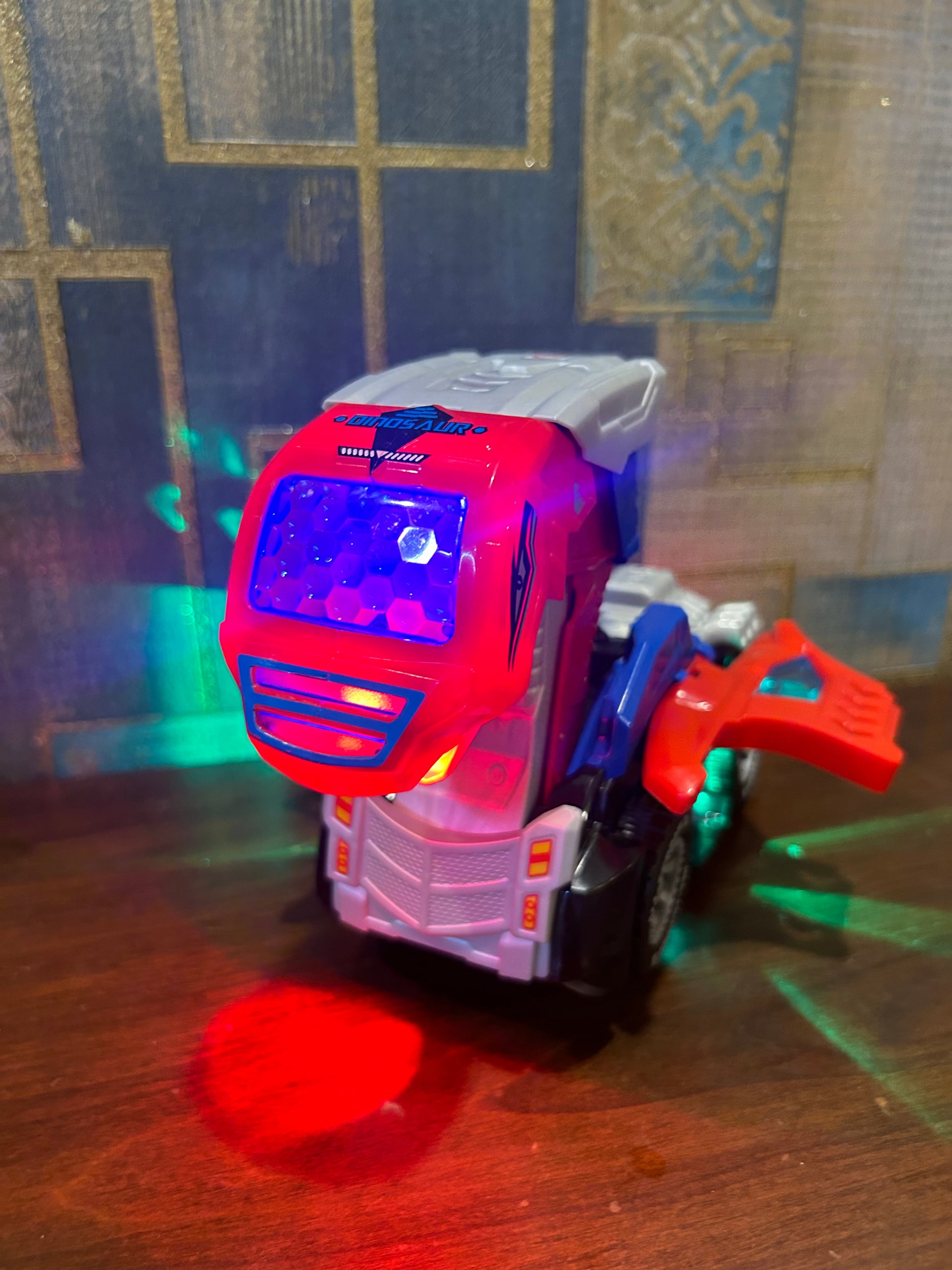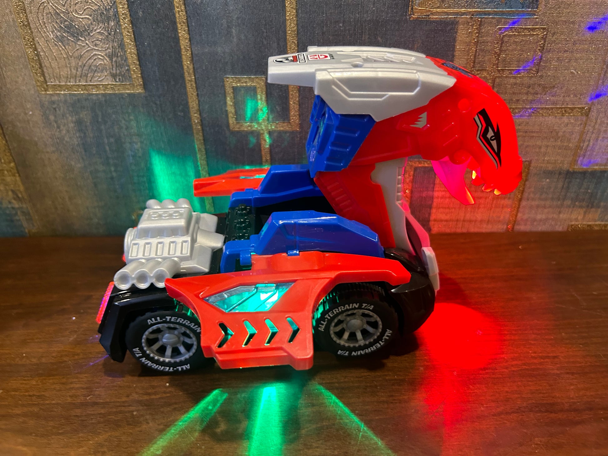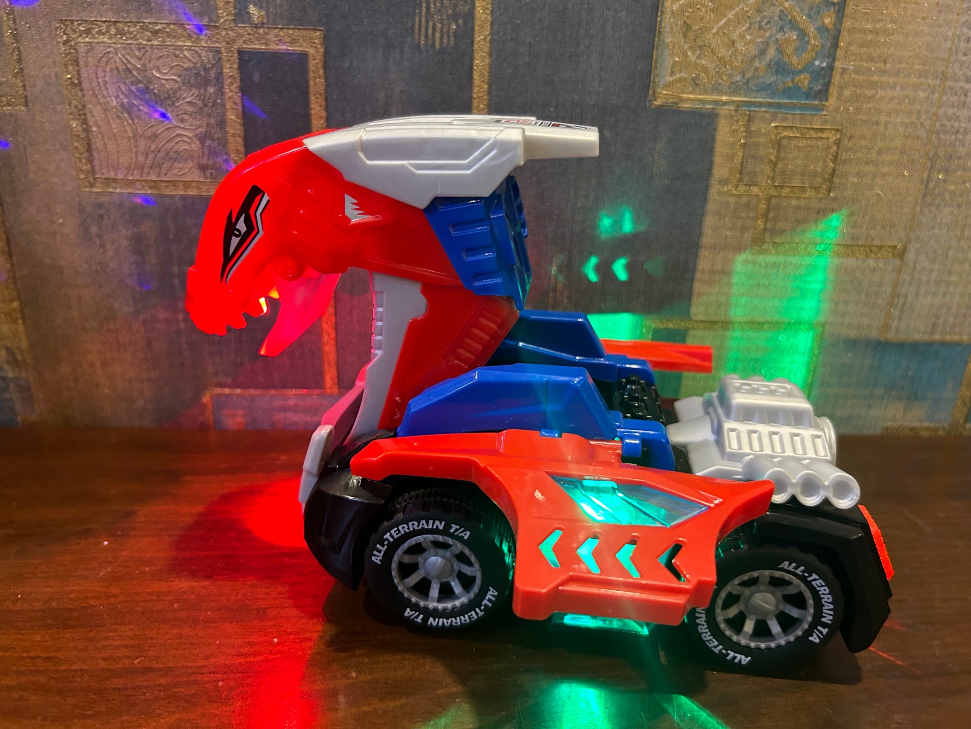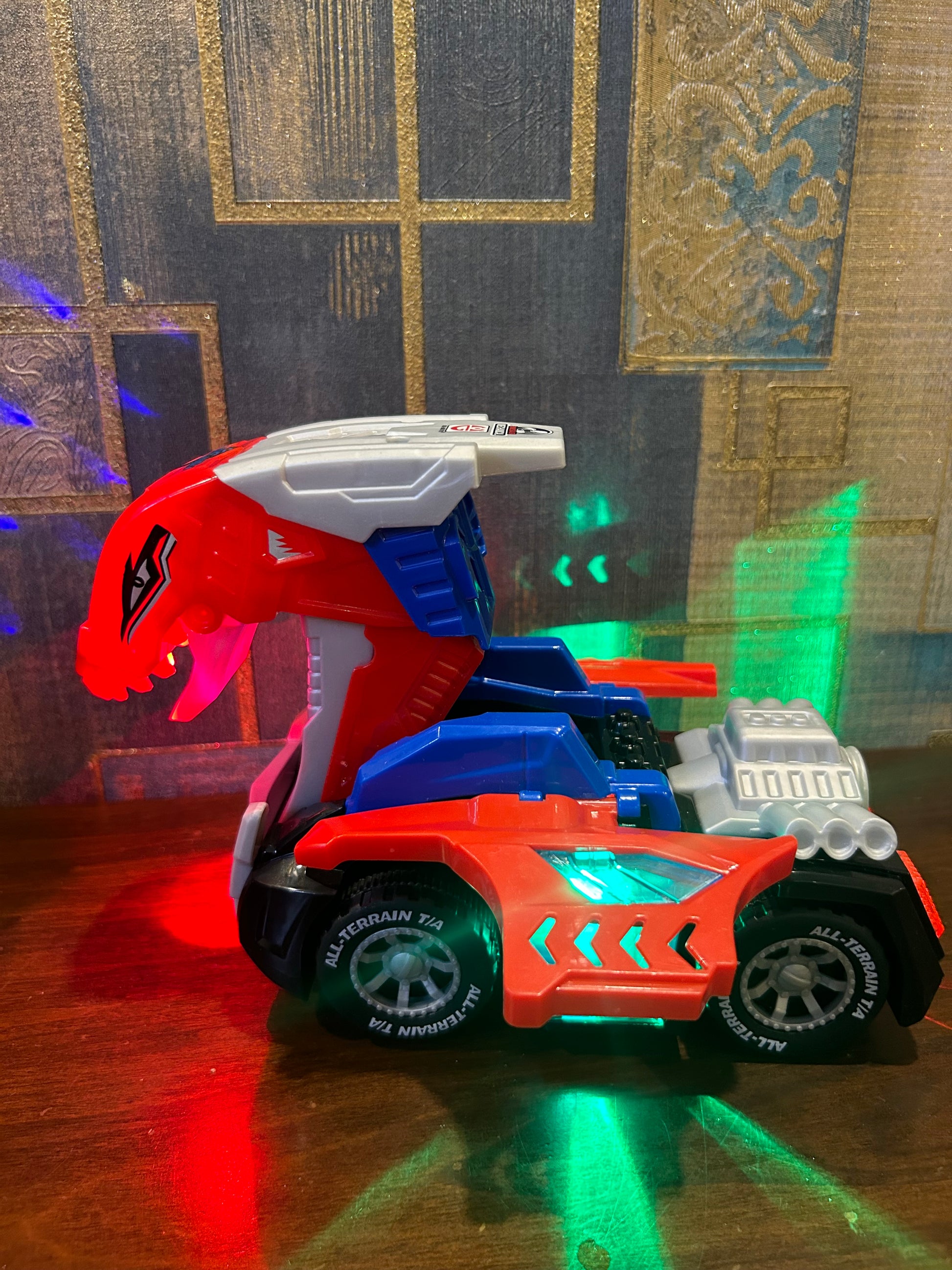 "Watch as this playful Brachiosaurus transforms into a speedy car, lighting up and playing music for endless fun!"
