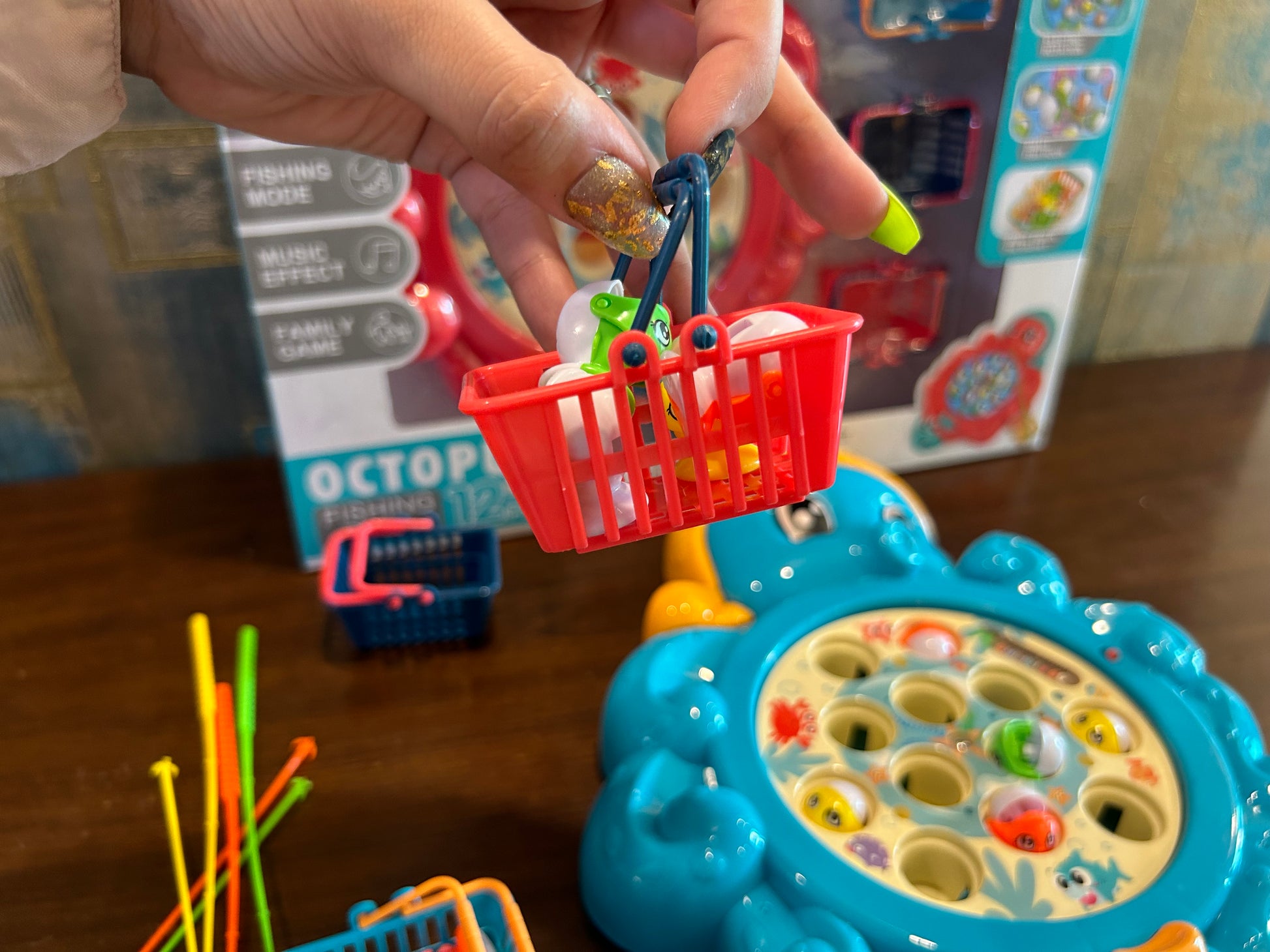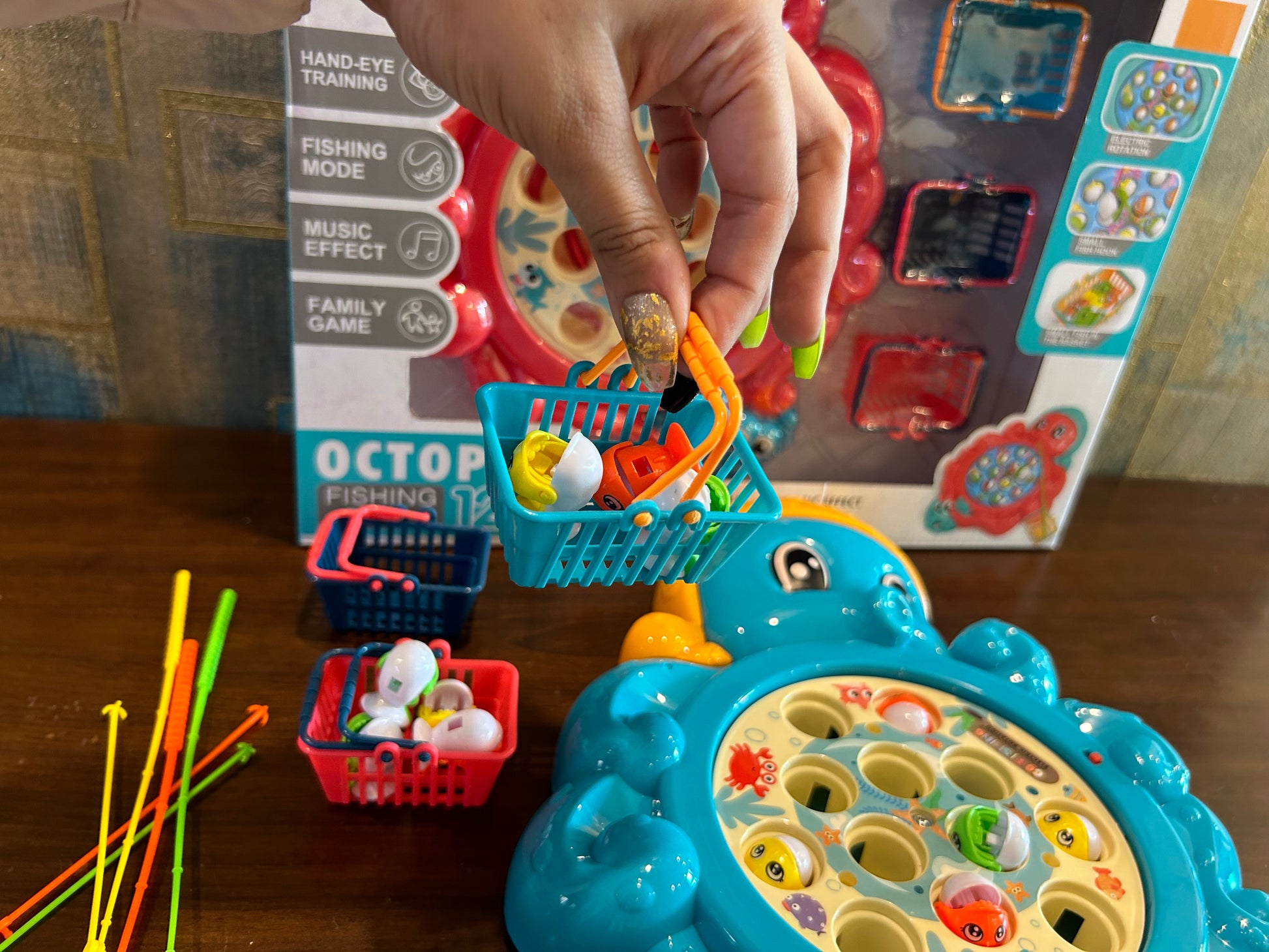 Helps in parent child interaction, hand eye training, keeps kids busy for long time, prevents screen time. Includes 3 Baskets, 12 Fishes and 3 Catching Sticks.