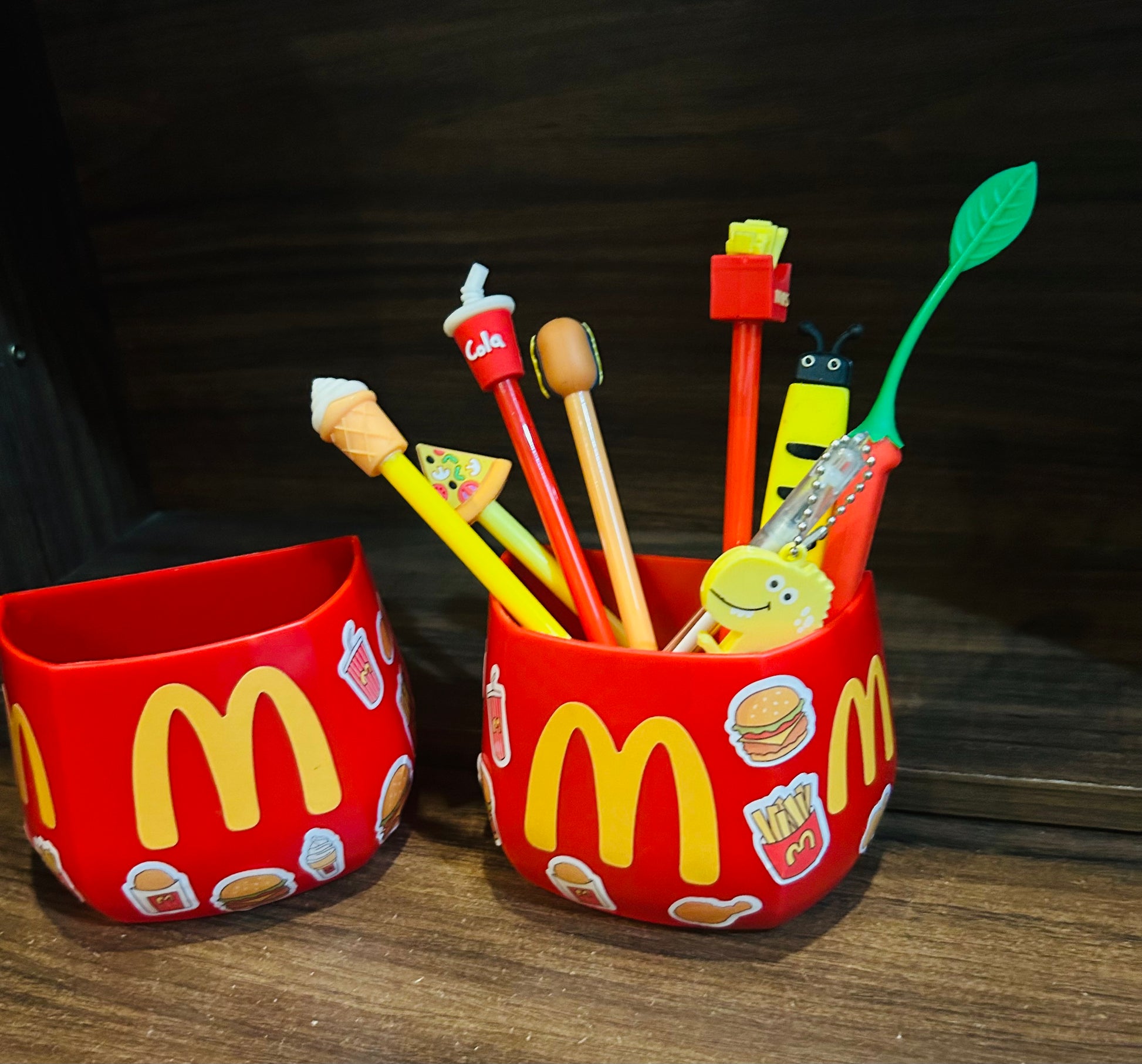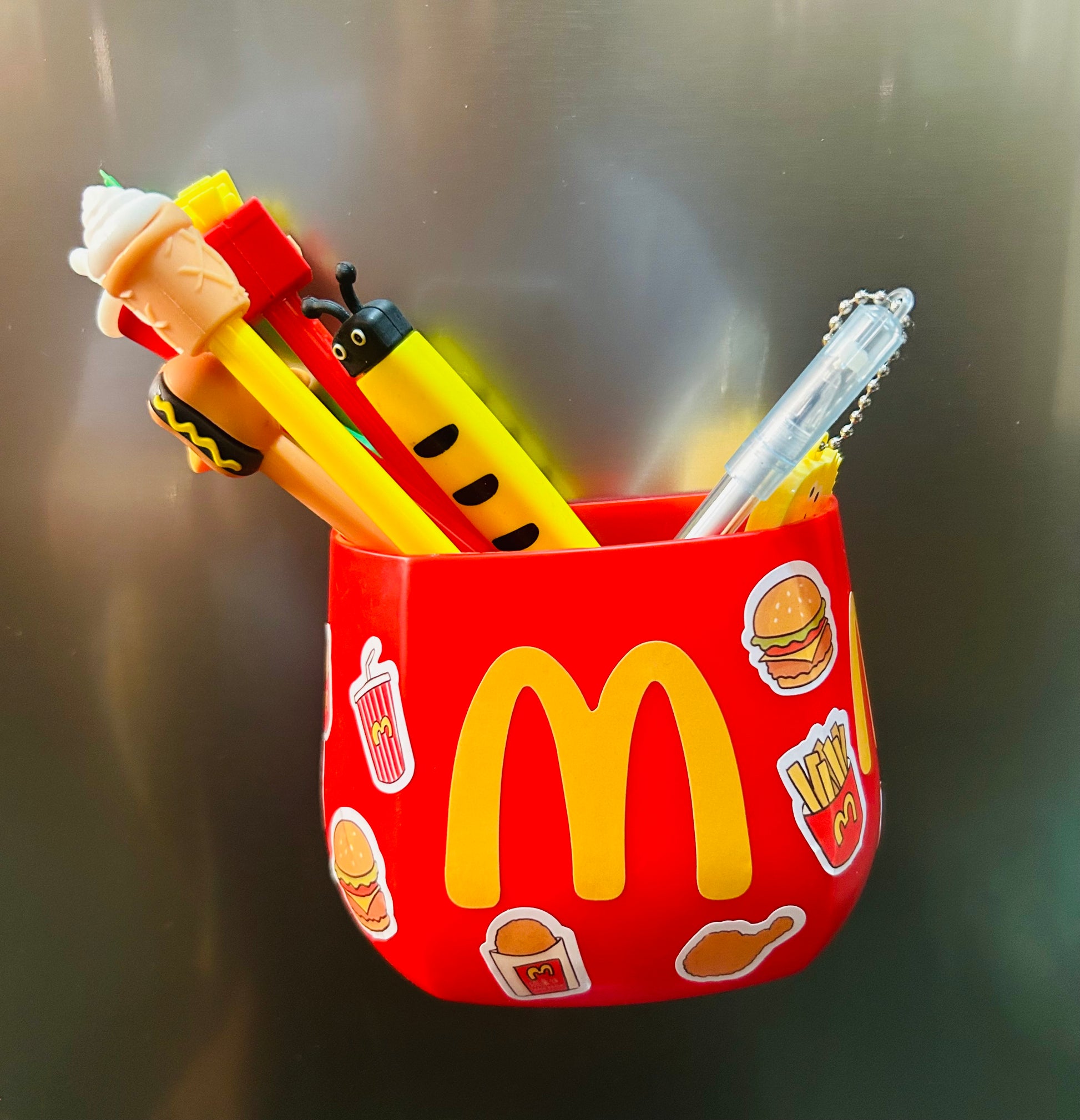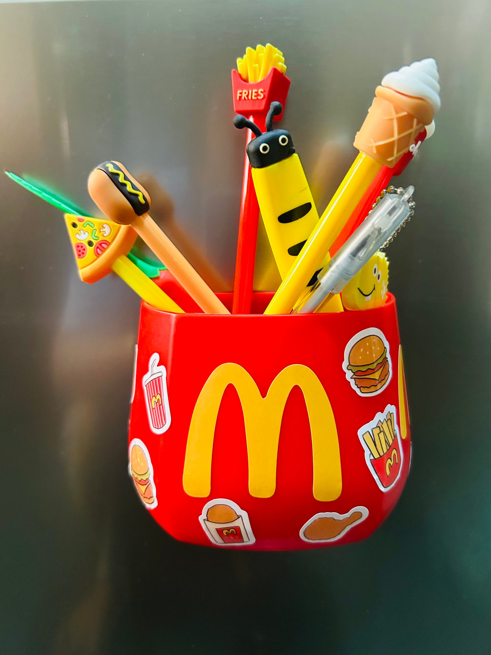 A magnetic holder designed with a McDonald’s theme It has a magnetic base to stick on metal surfaces like refrigerators or desks. The top has space to hold pens, pencils, and other stationery items. This way, you can add a touch of McDonald’s charm to your workspace while keeping your pens organized and easily accessible.