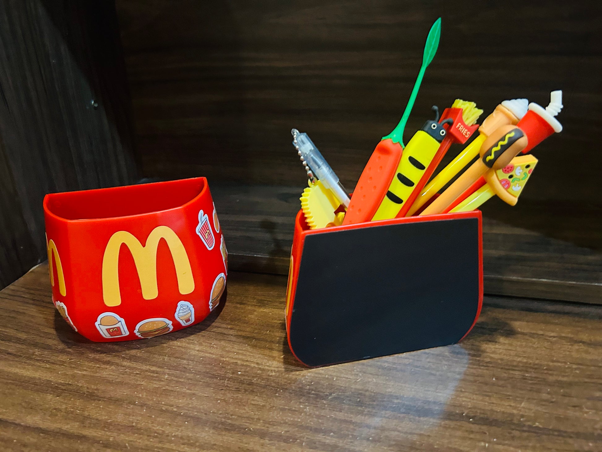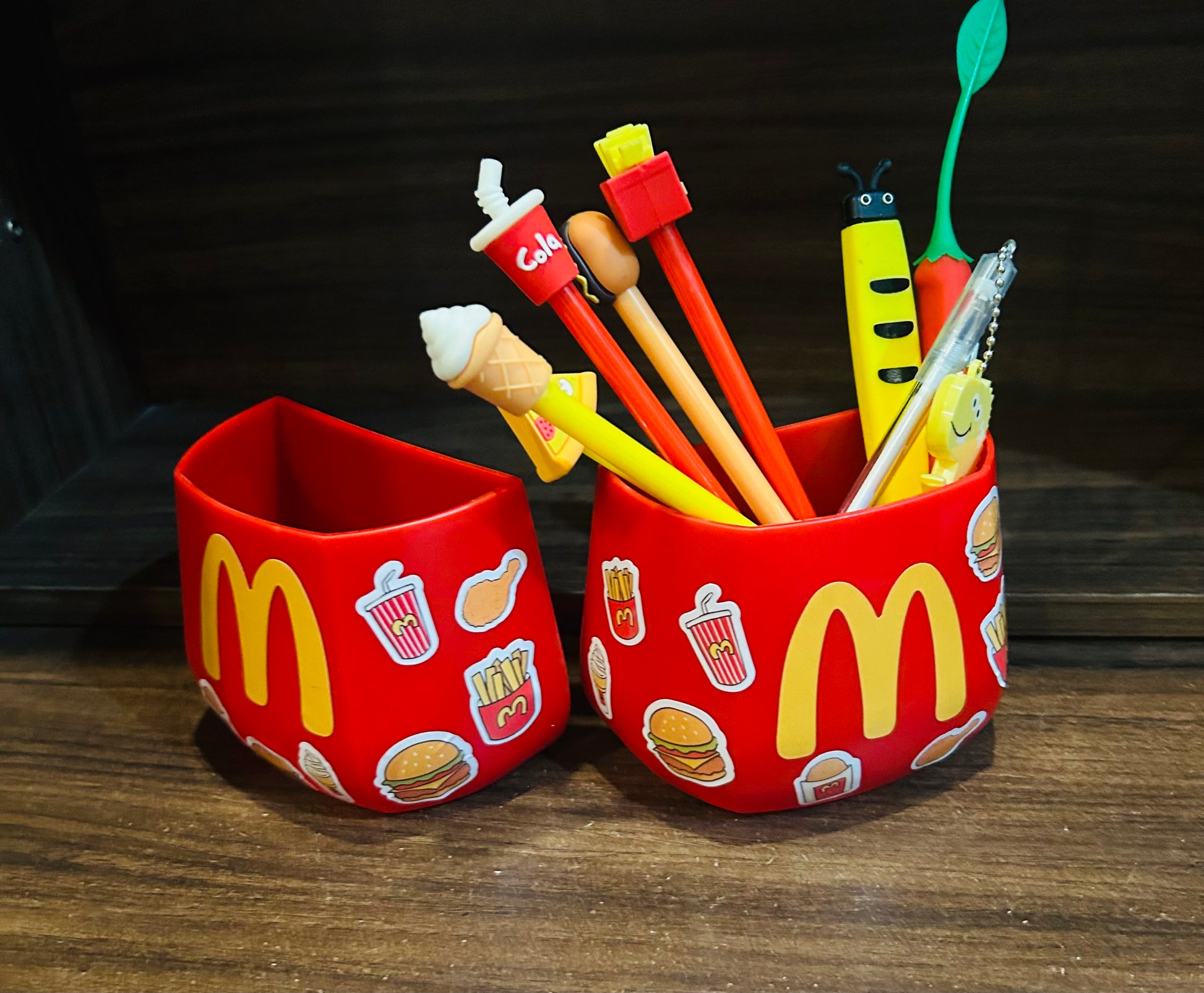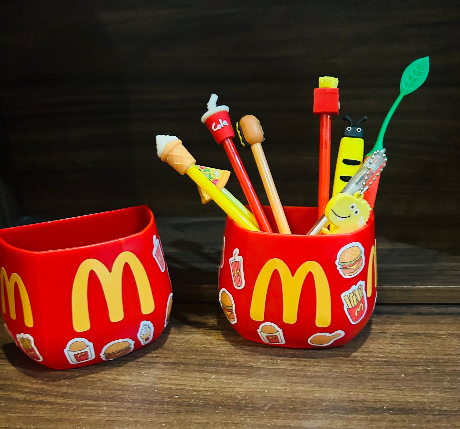 A magnetic holder designed with a McDonald’s theme It has a magnetic base to stick on metal surfaces like refrigerators or desks. The top has space to hold pens, pencils, and other stationery items. This way, you can add a touch of McDonald’s charm to your workspace while keeping your pens organized and easily accessible.