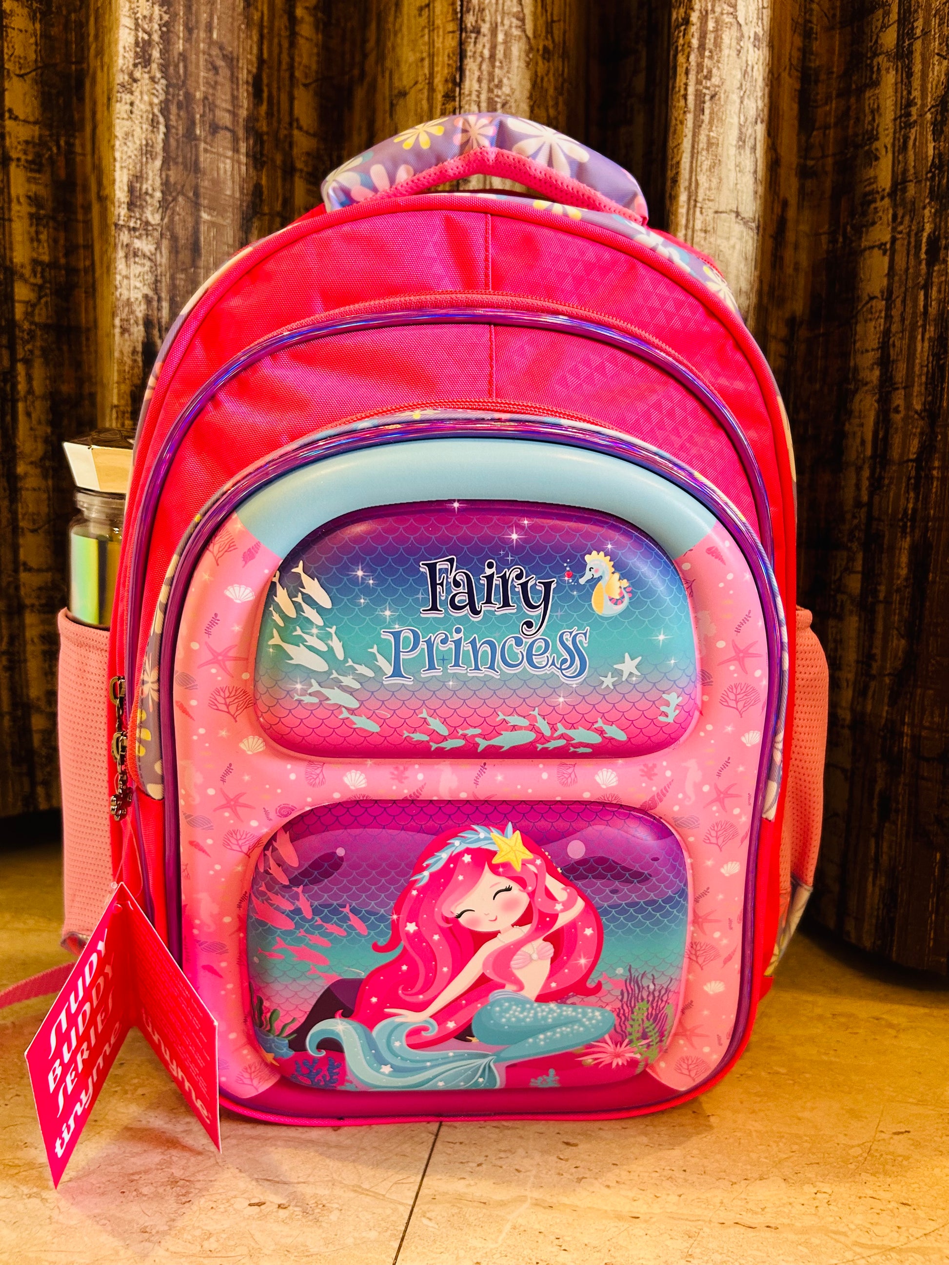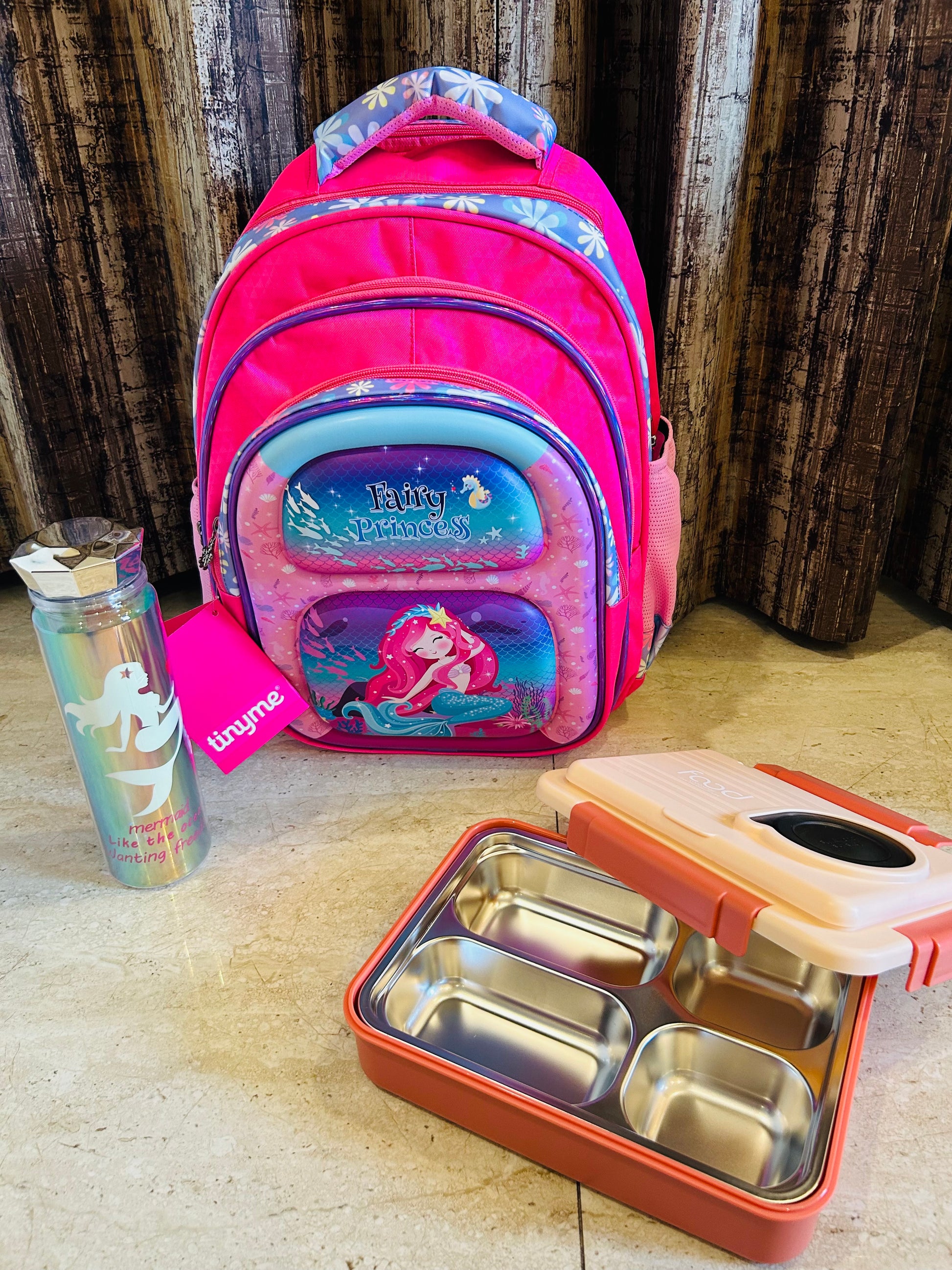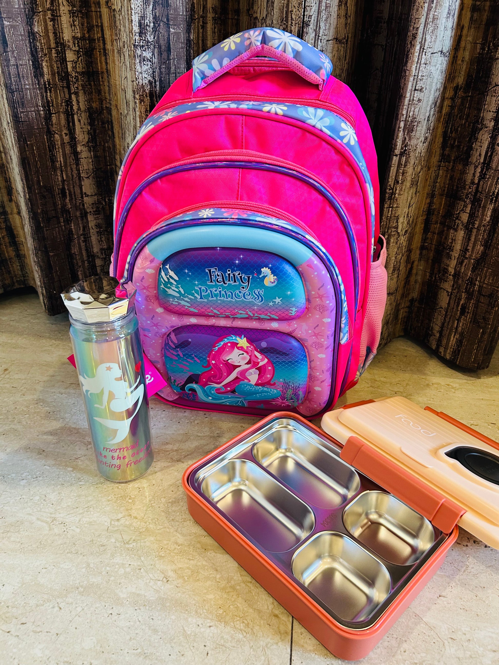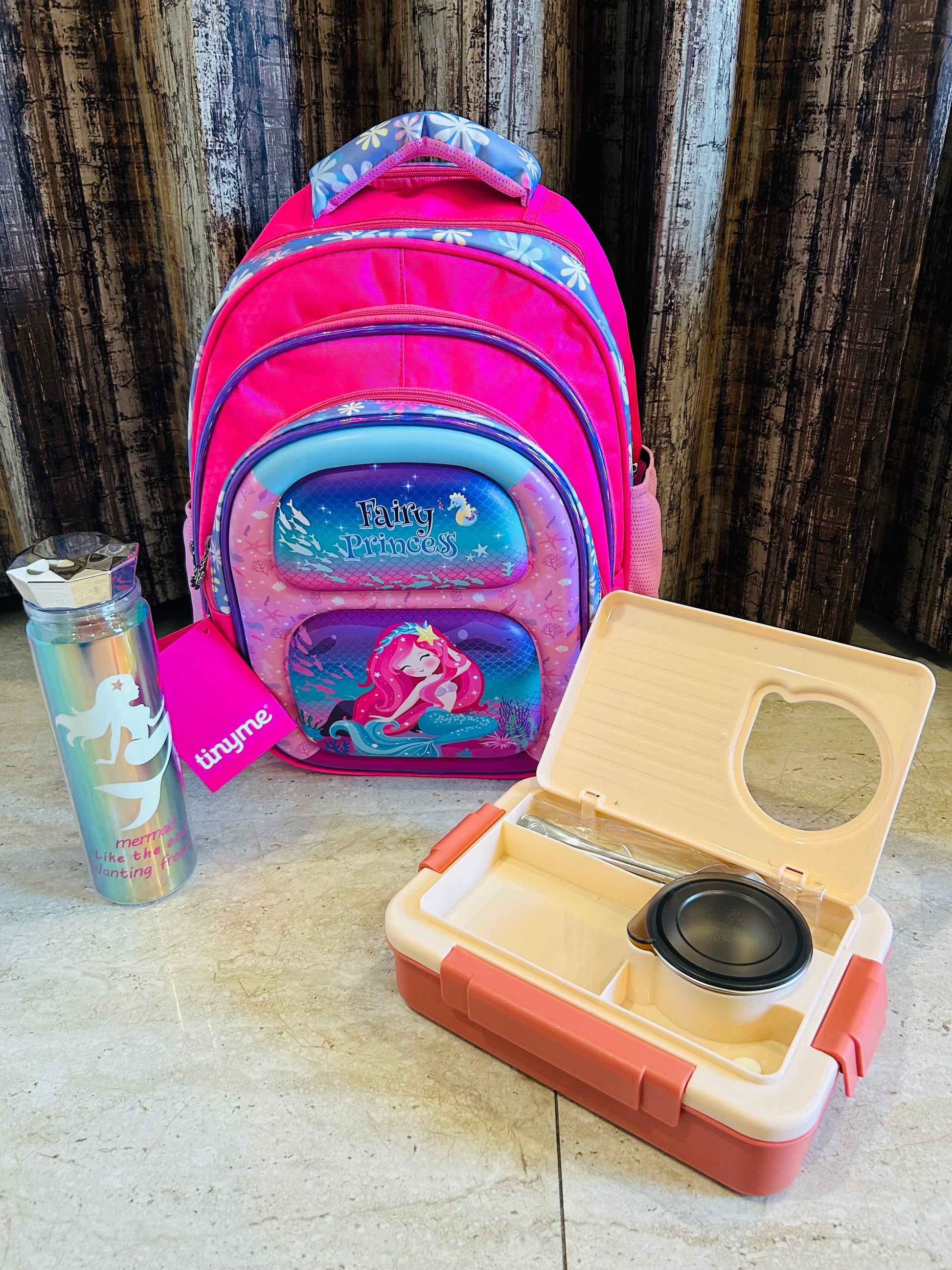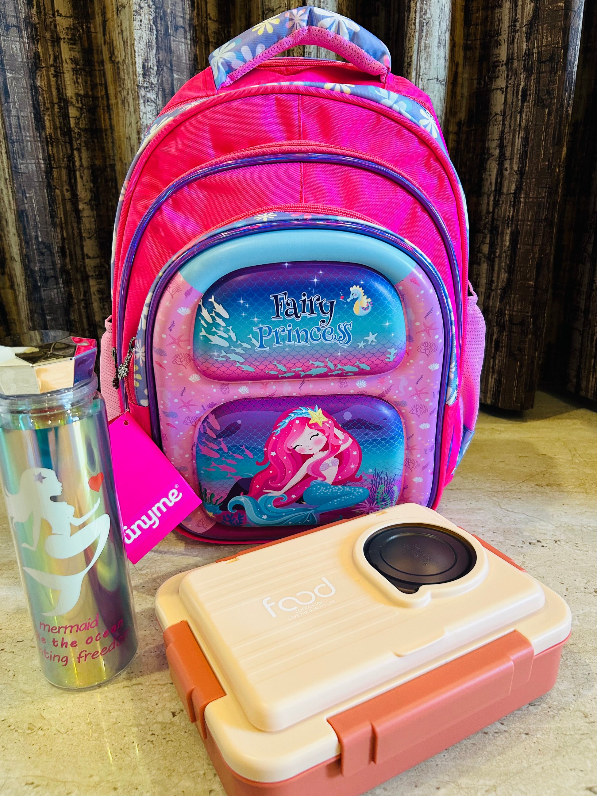 Mermaid school bag combo includes school bag, holographic bottle and tiffin box