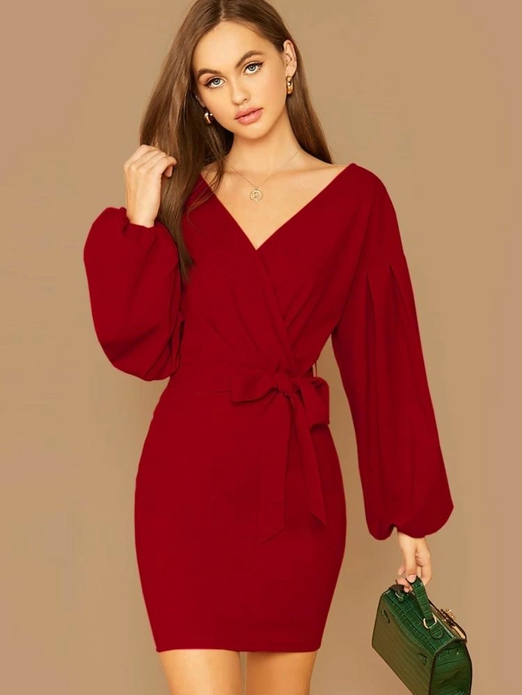 Shein Surplice Neck Lantern Sleeve Belted Dress(Fits Upto 44 Inch)