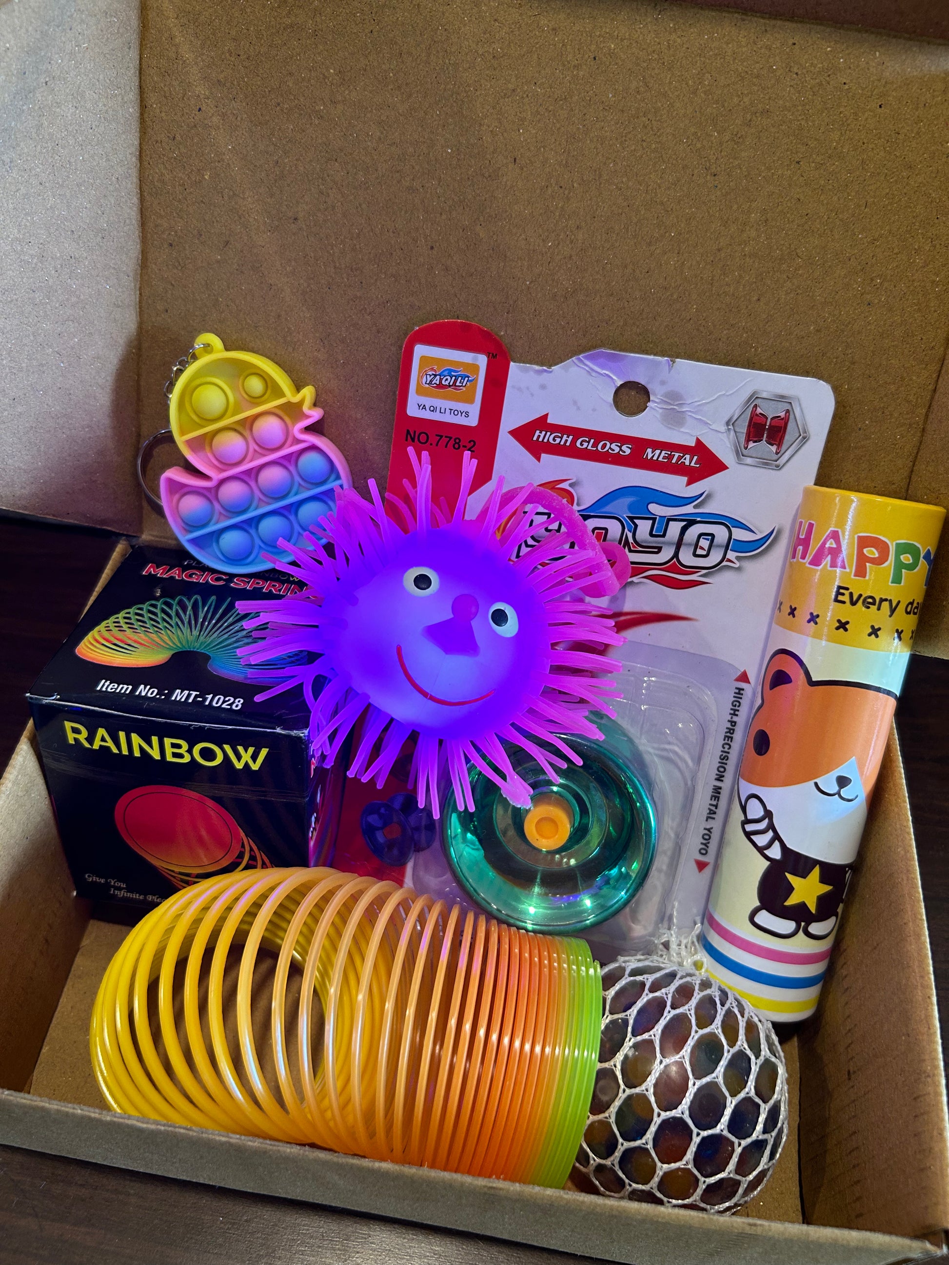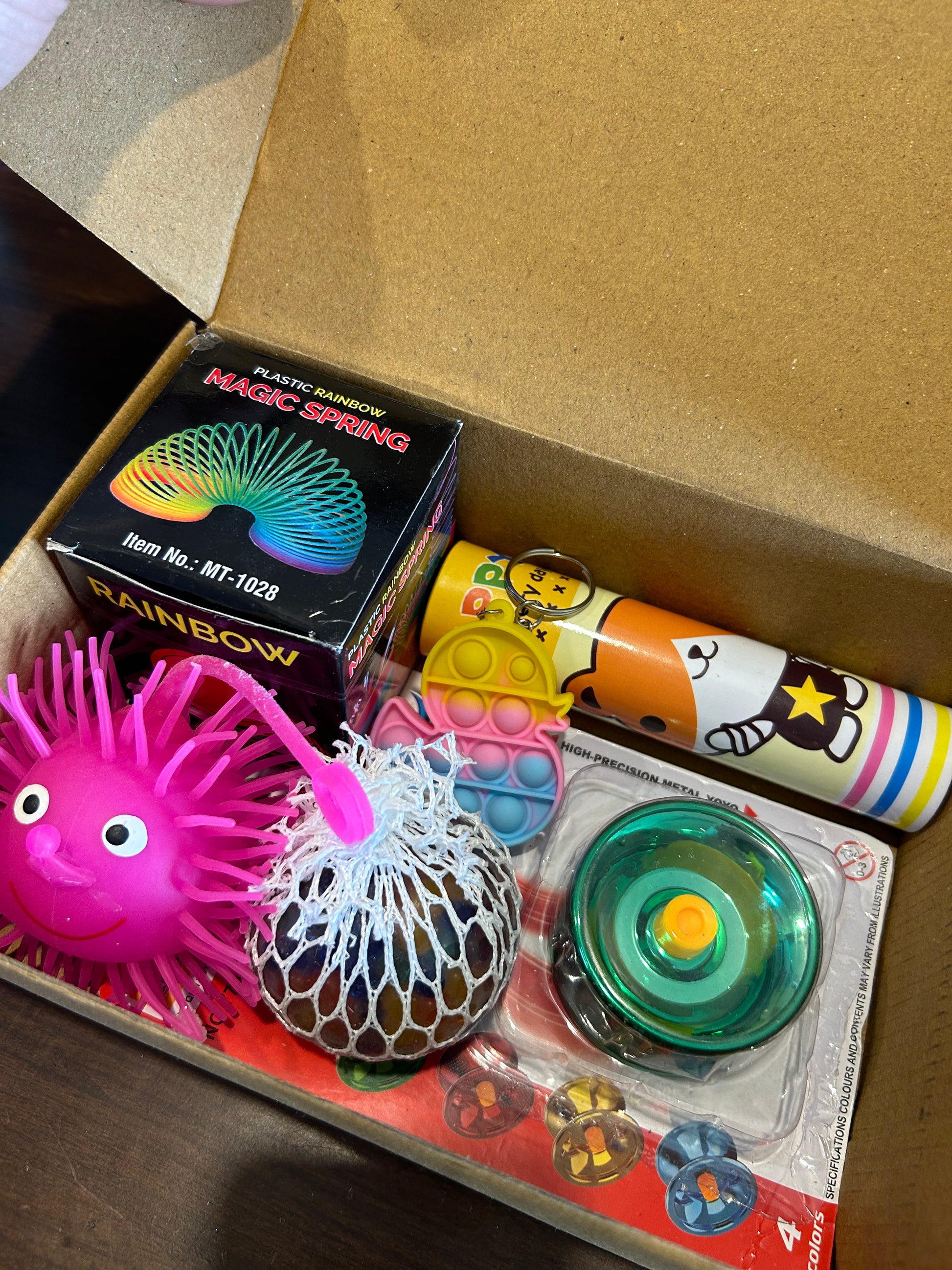 इसमें कैलीडोस्कोप, लाइट पफर बॉल, मेश बॉल, पॉप इट कीचेन, रेनबो मैजिक स्प्रिंग और योयो स्पिनर शामिल हैं।