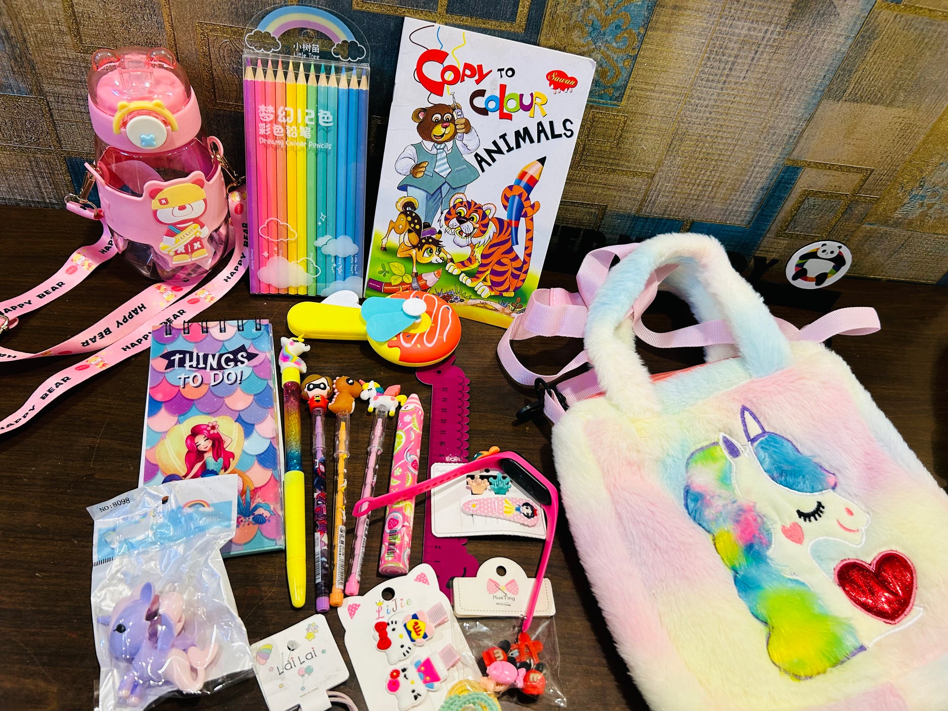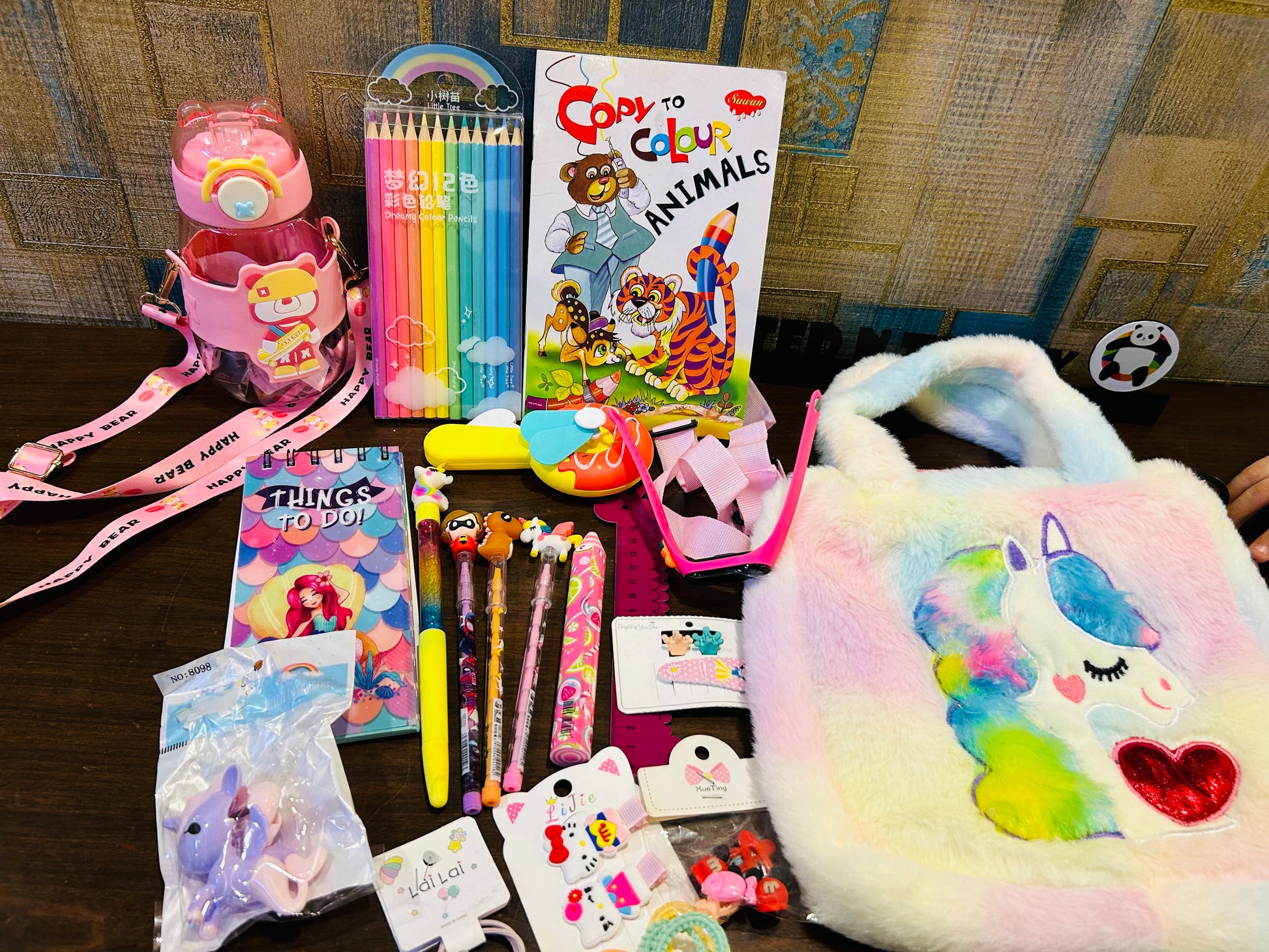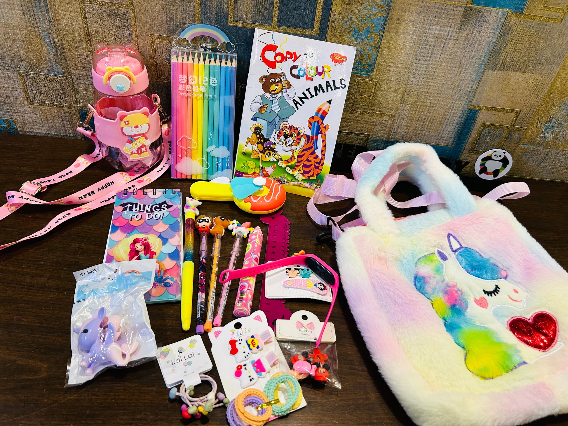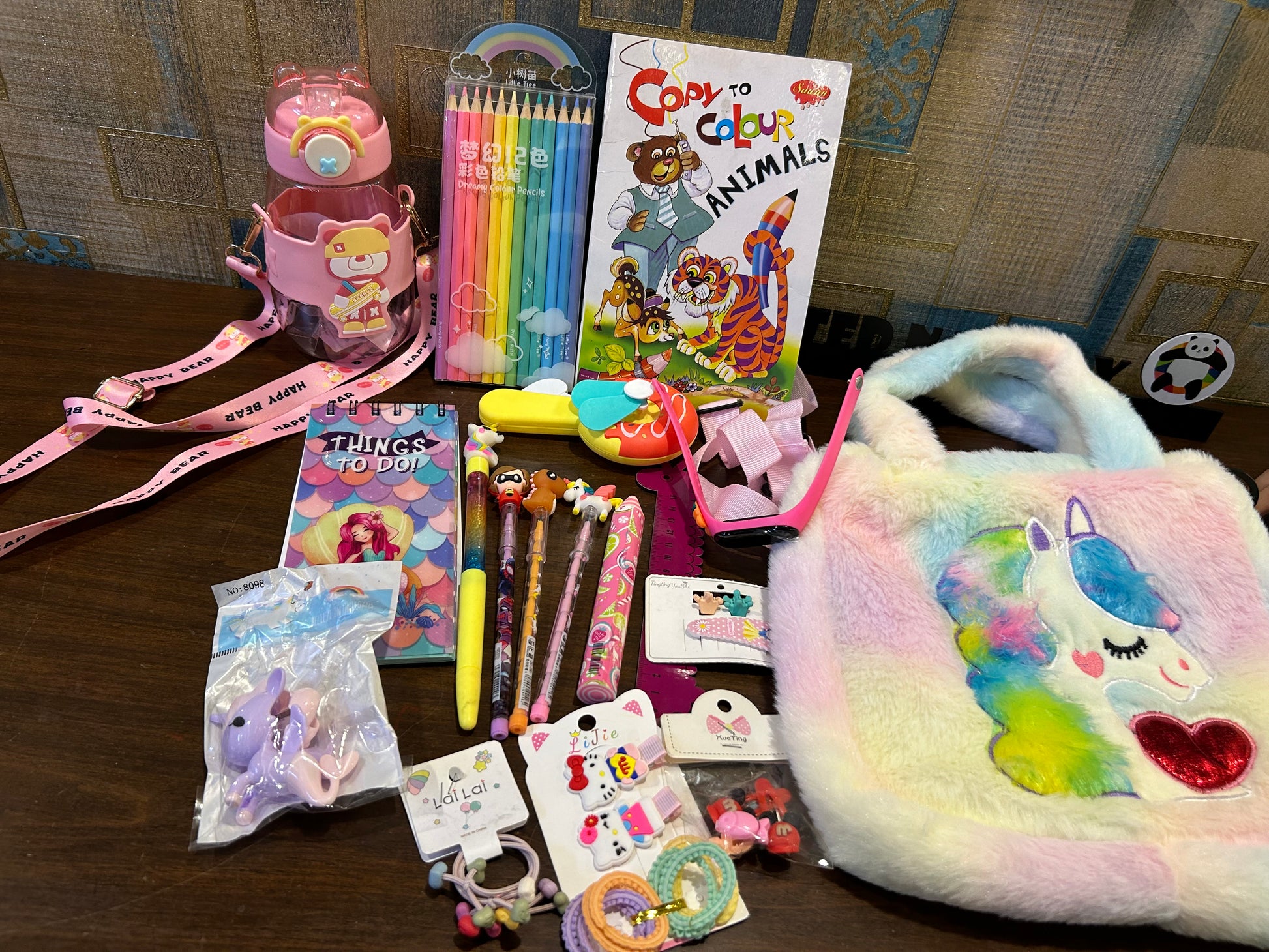 Fur bag, colouring book, colouring pencils, sipper, notepad, sharpener, eraser, pencils, scale, hair accessories, glitter pen and watch