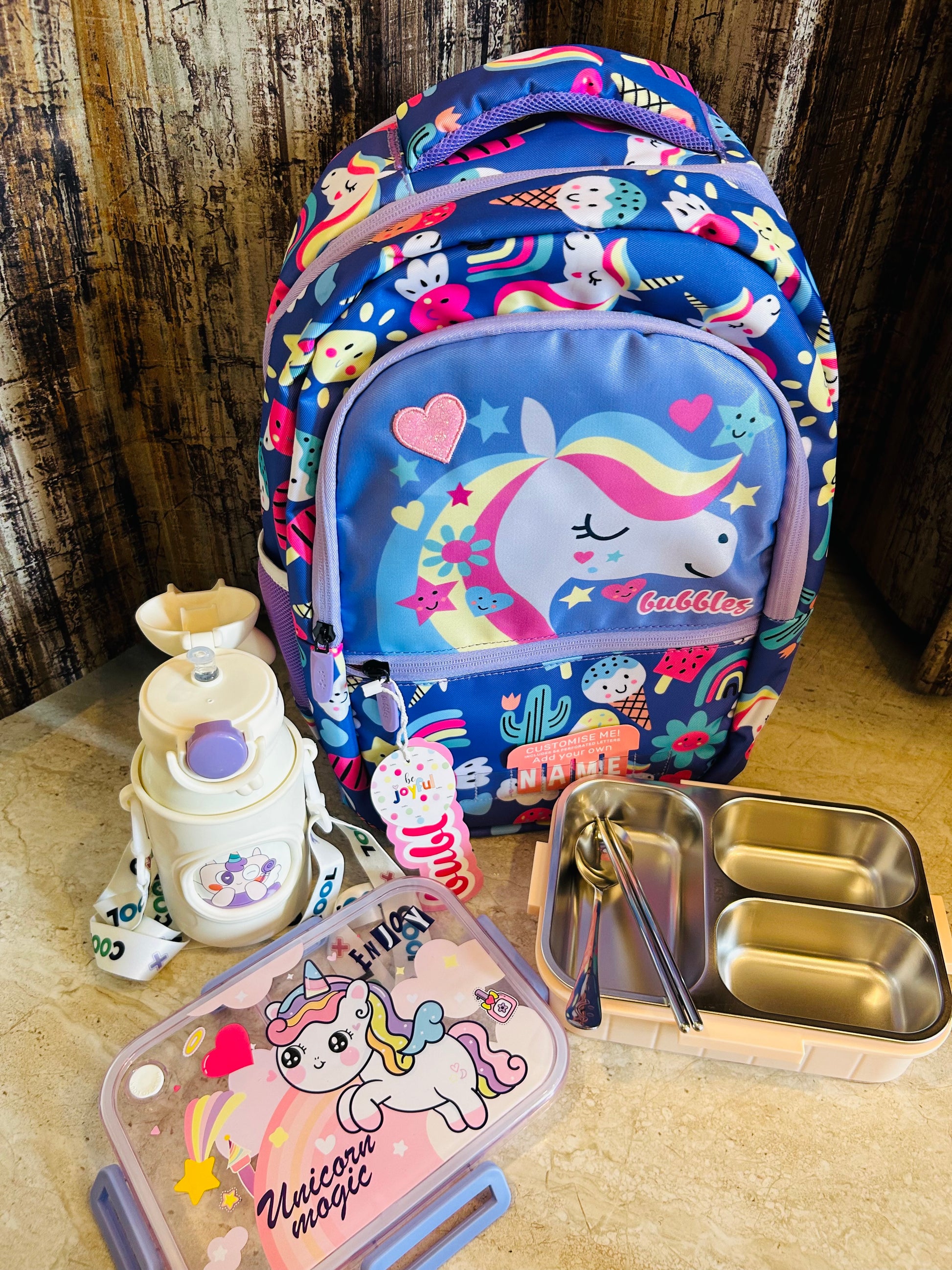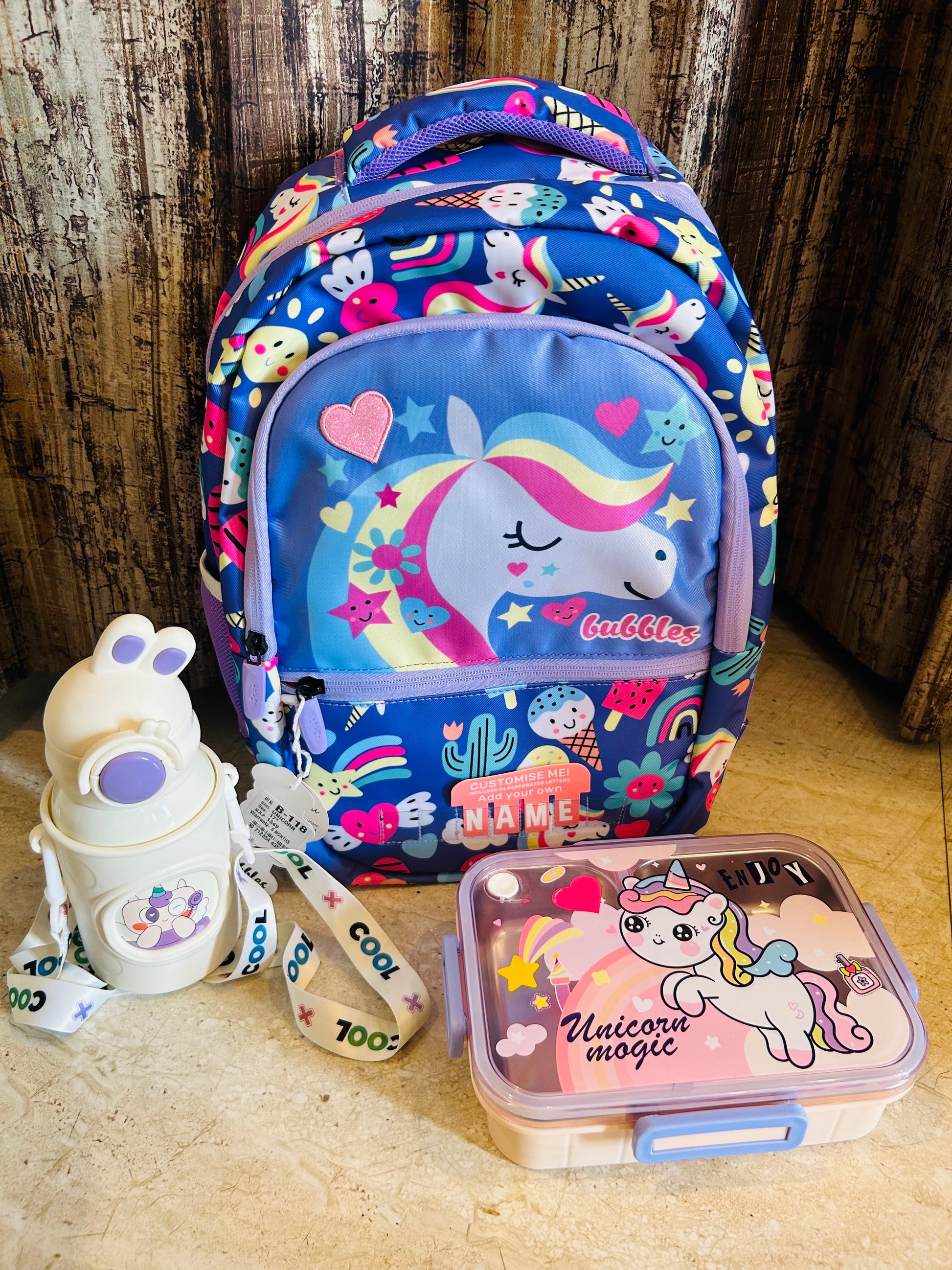 Introducing the magical Unicorn Combo! This enchanting set includes a sturdy school bag adorned with vibrant unicorn designs, perfect for carrying books, stationery, and all your essentials. The unicorn stainless steel insulated tiffin box keeps your meals fresh and delightful throughout the day, featuring a whimsical unicorn motif that adds a touch of fantasy to lunchtime. Completing the set is the unicorn sipper, featuring a spill-proof design and a charming unicorn horn lid, making hydration fun and stylish. Embrace the magic of unicorns with this delightful combo, designed to brighten up every school day!