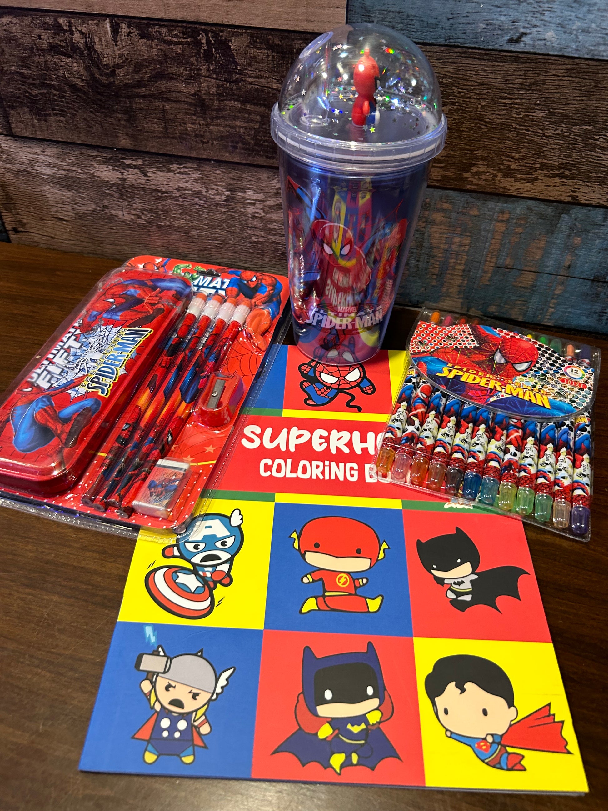 Stationery Set, Spiderman Sipper, Colouring Book and Rolling Crayons