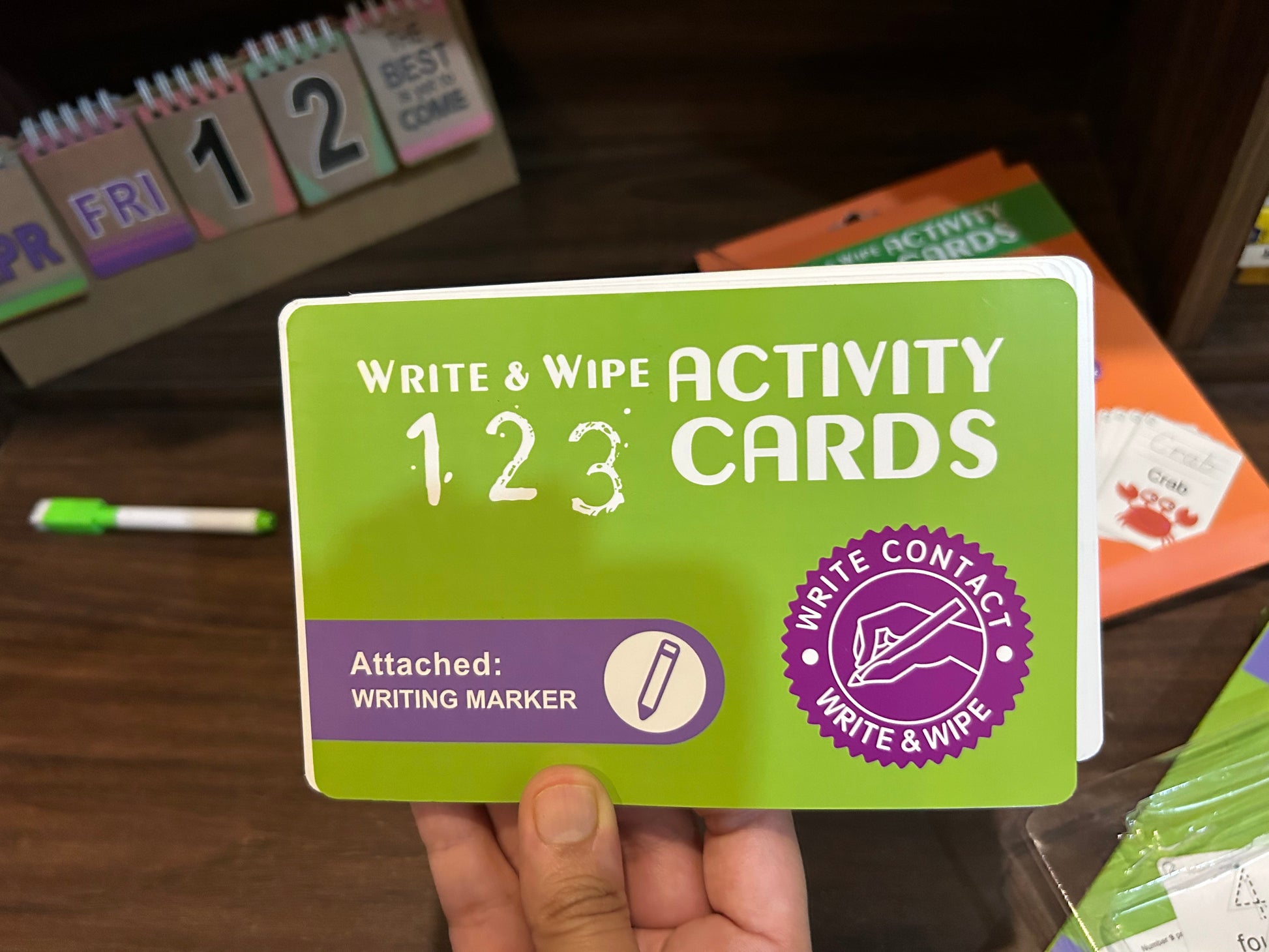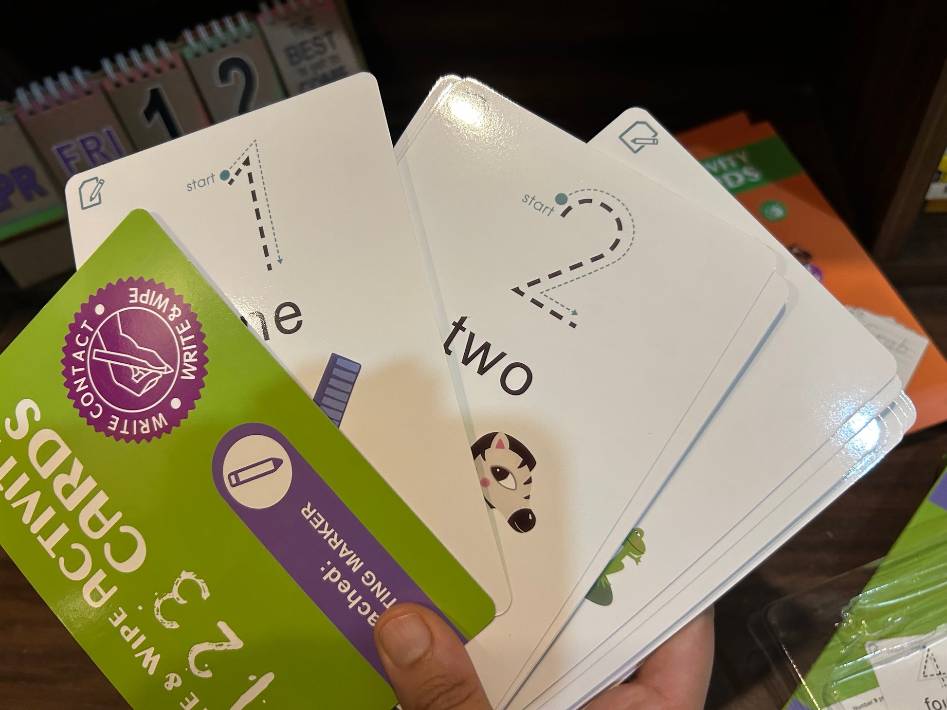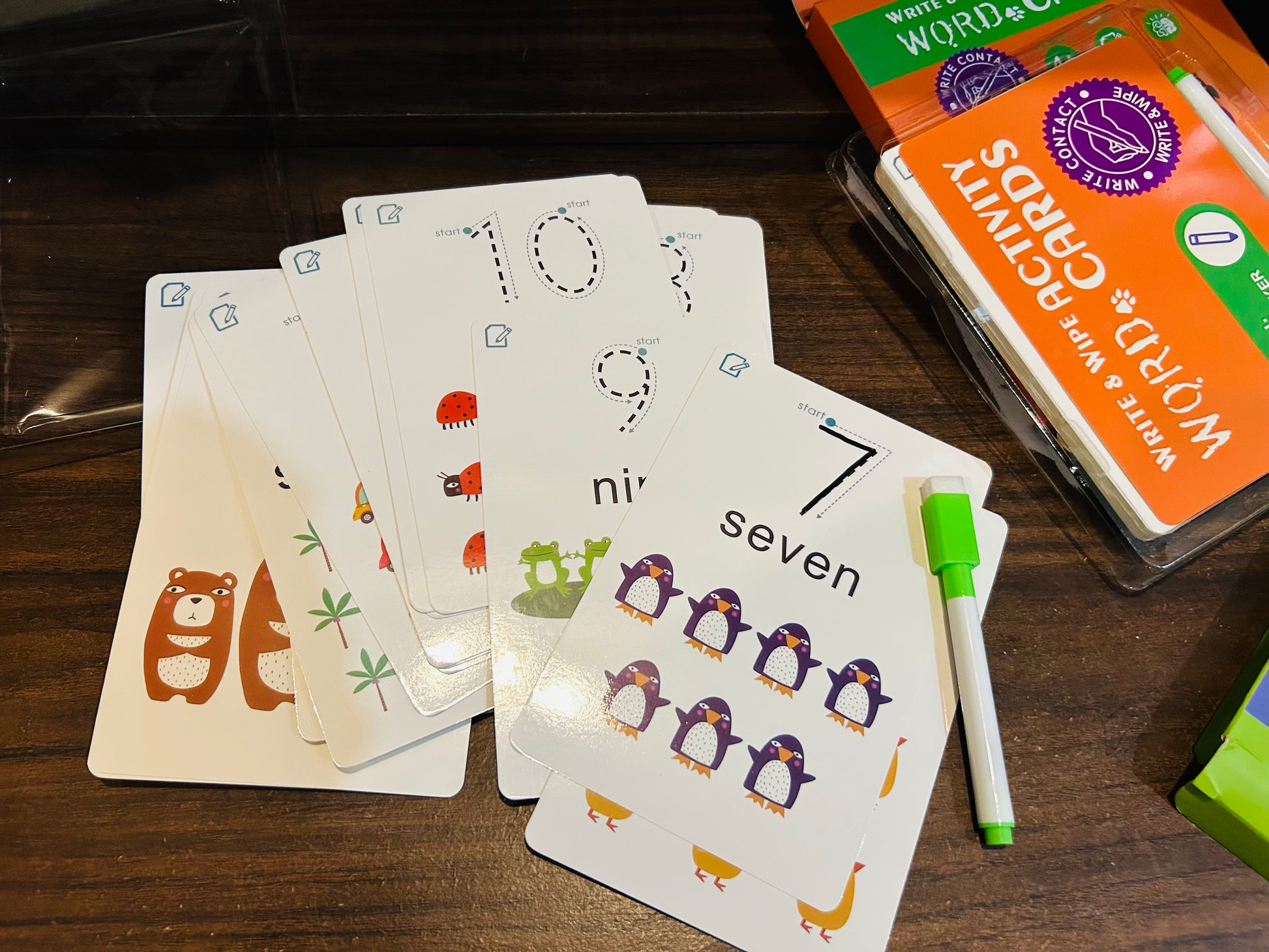 Children learn the word/numbers and practice printing -one word at a time. Write & wipe cards allow kids to practice printing again and again. Kids build word/numbers knowledge while improving finger dexterity and fine motor control.