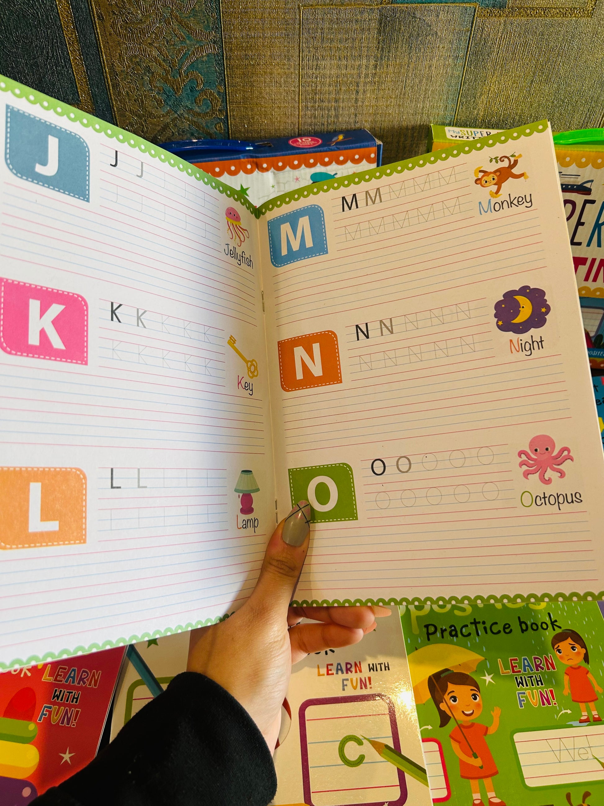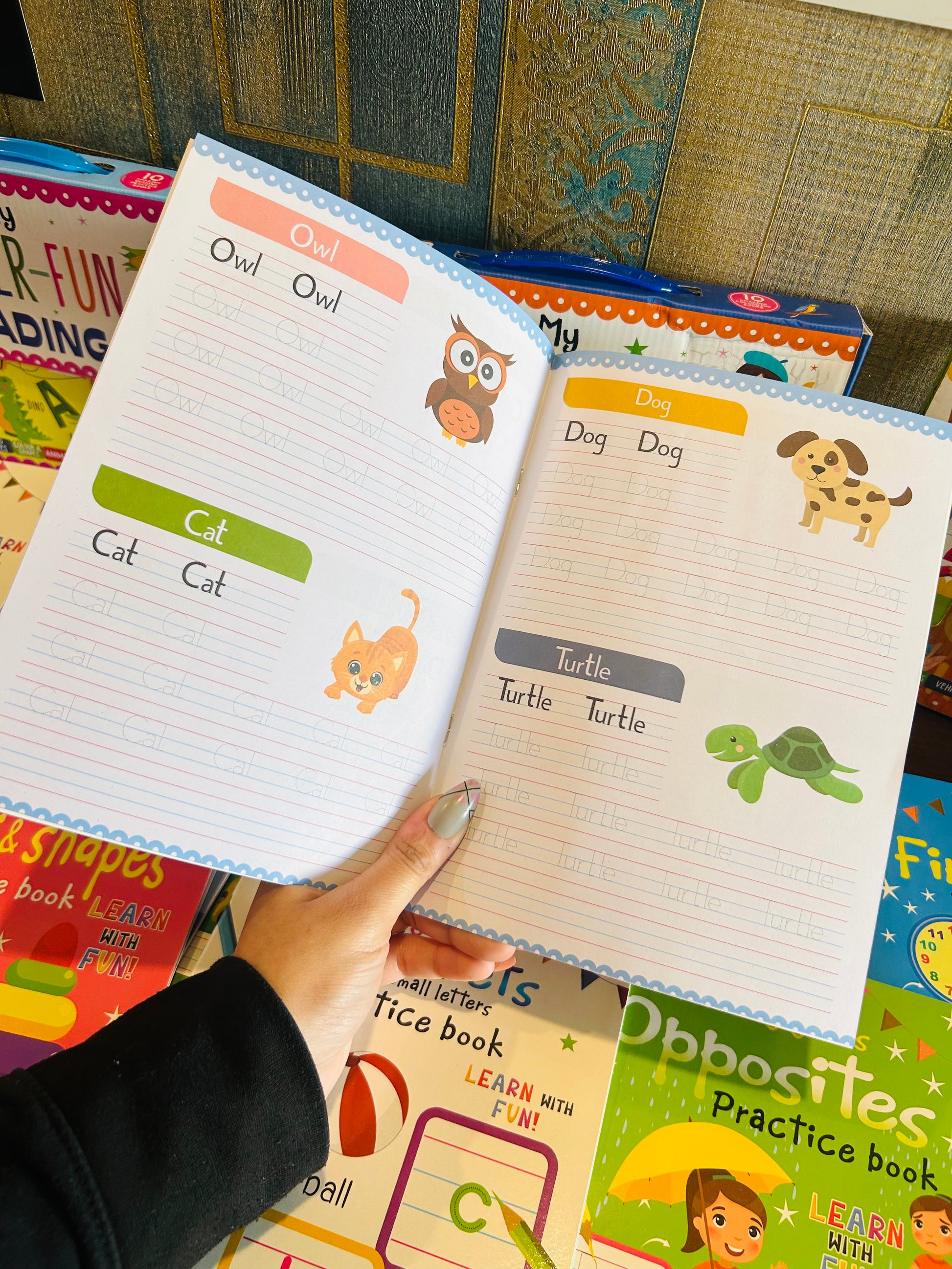 Alphabets- Capital Letters, Numbers, Vehicles, Animals, First Words, At Home, Opposites, Alphabets- Small Letters, Colour and Shapes, Things Around Us.