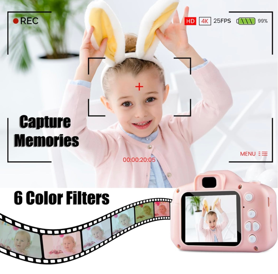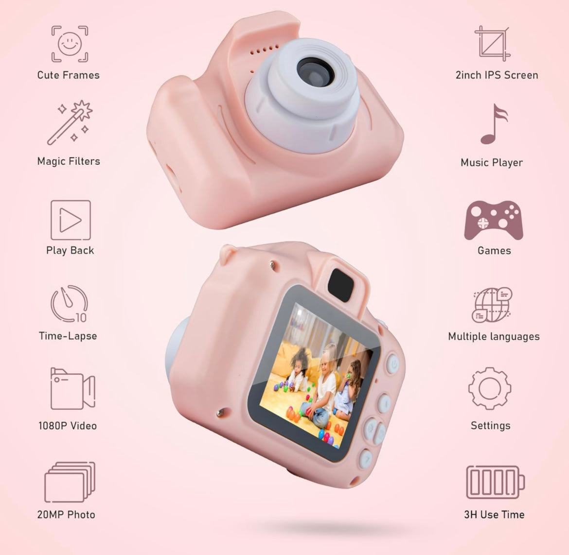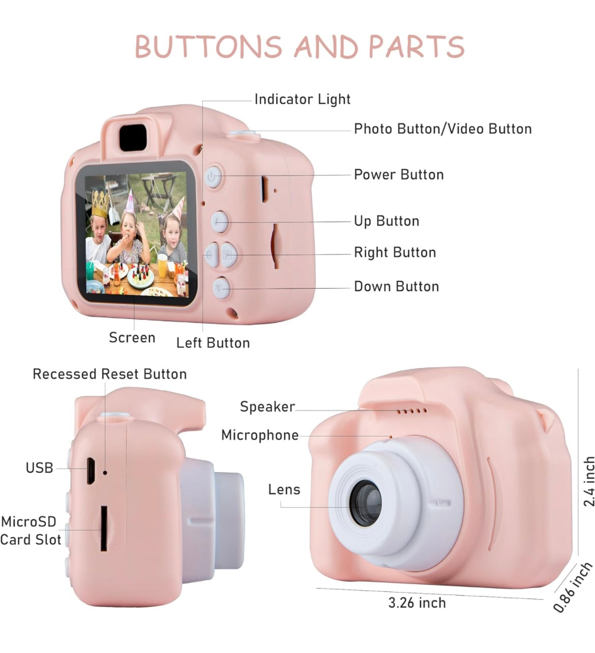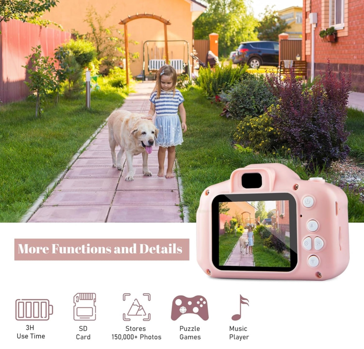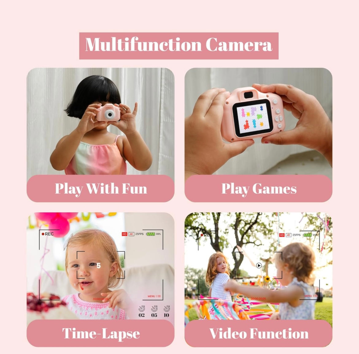 Video Recording and photo: This feature enables kids to simulate recording short videos just like a real camera. They can capture pretend moments and play them back on the camera’s screen. When the “Video Recording” feature is activated on the toy camera, children can press a designated button to start “recording” a video.