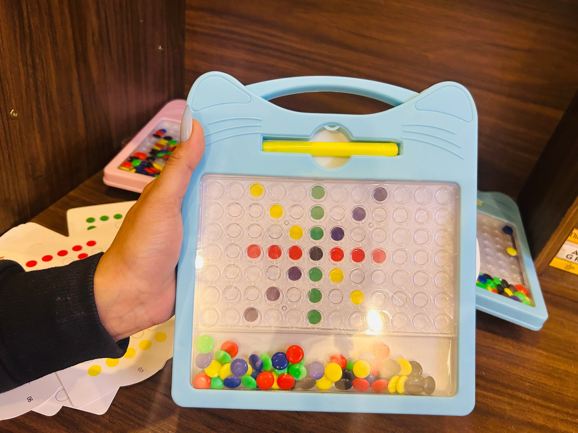 A Magnetic Magpad Dots stylus is the pen, the bead board is the paper, and your finger is the eraser. The pull of the magnet engages sense memory in early writing lessons. Improves hand eye coordination and learn colours and alphabets in a fun way.