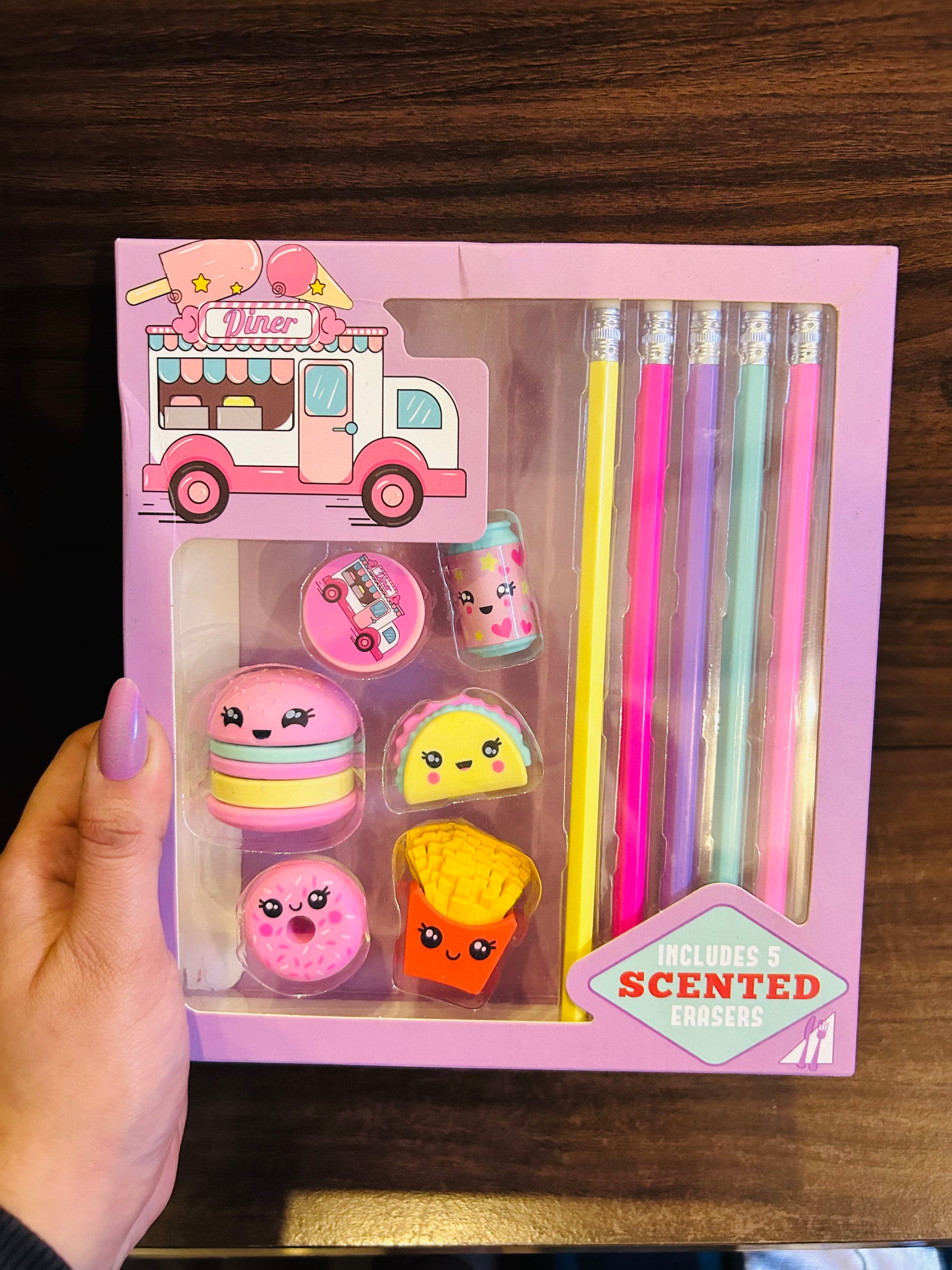Includes 5 Pencils, 5 Scented Erasers and 1 Sharpener.