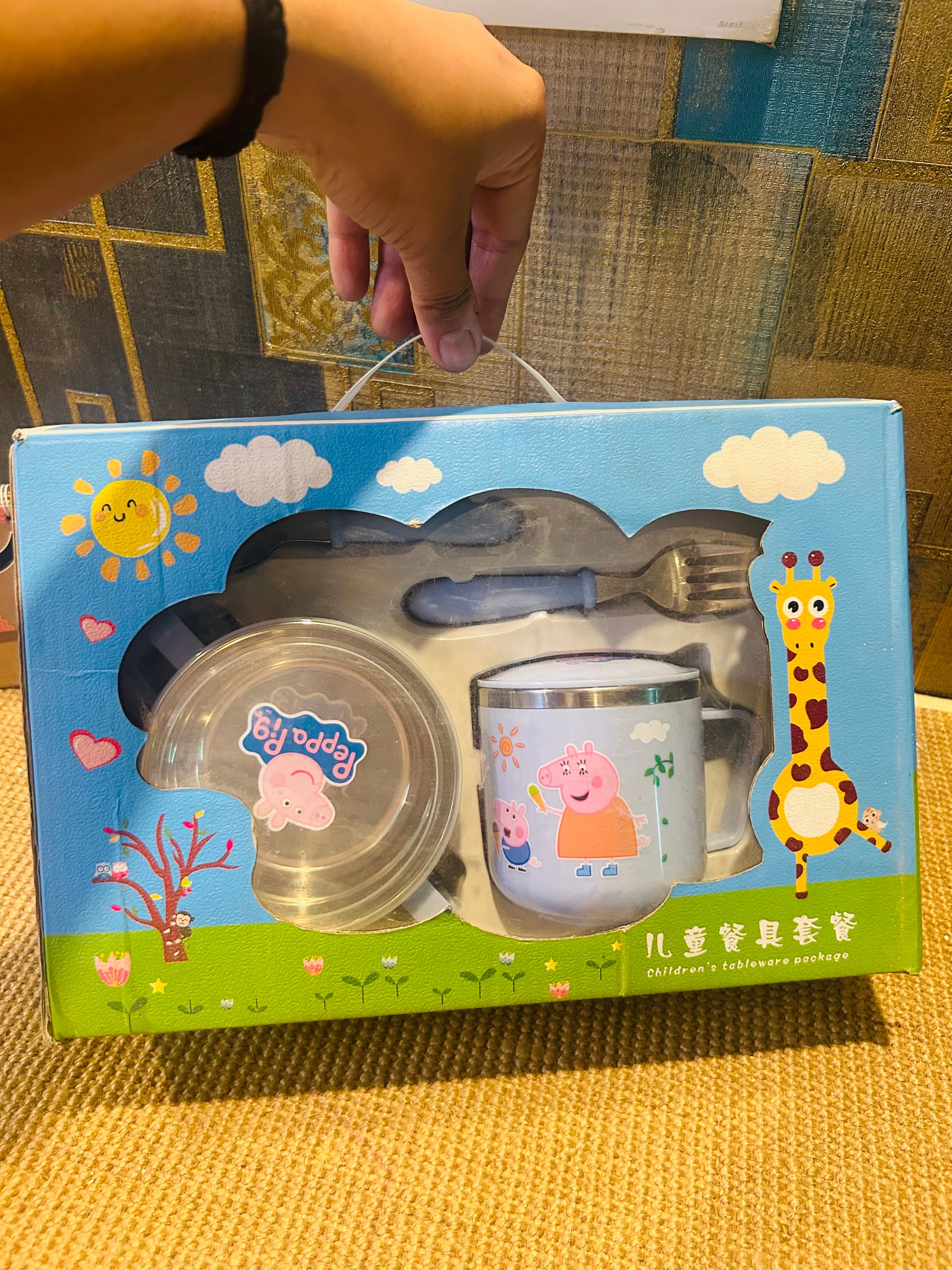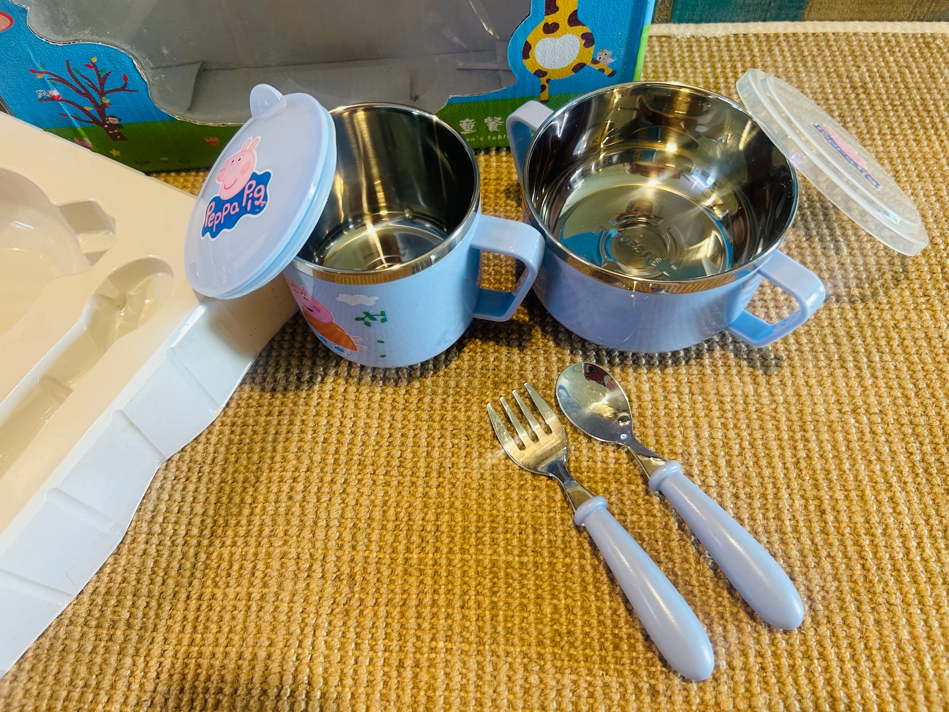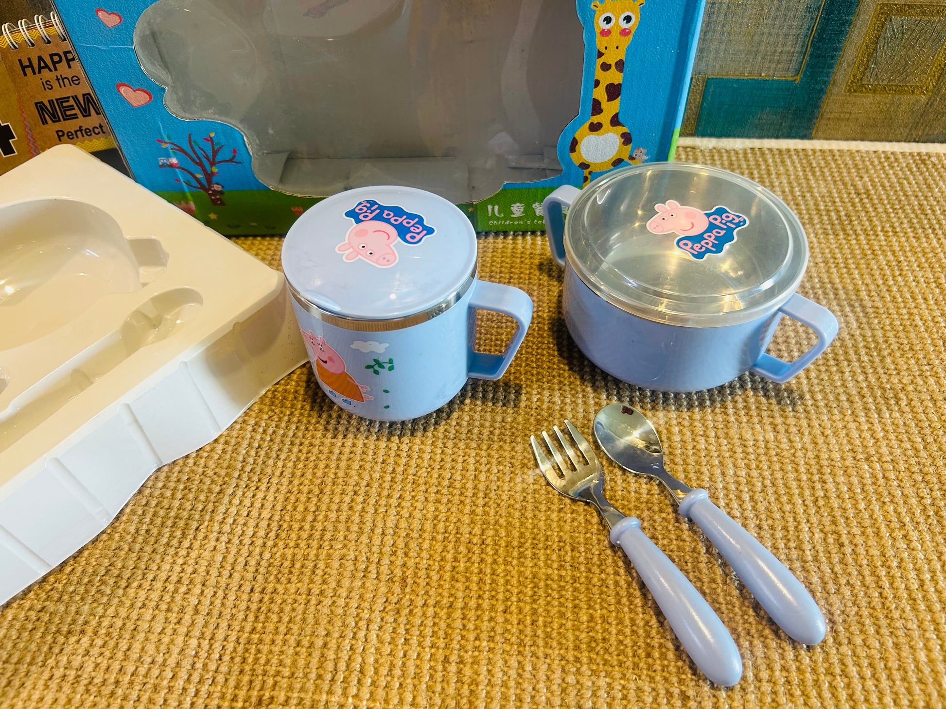 Make mealtime oinktastic with the Peppa Pig Stainless Steel Dinner Set – includes cup, bowl, fork, and spoon for little piggies on the go.