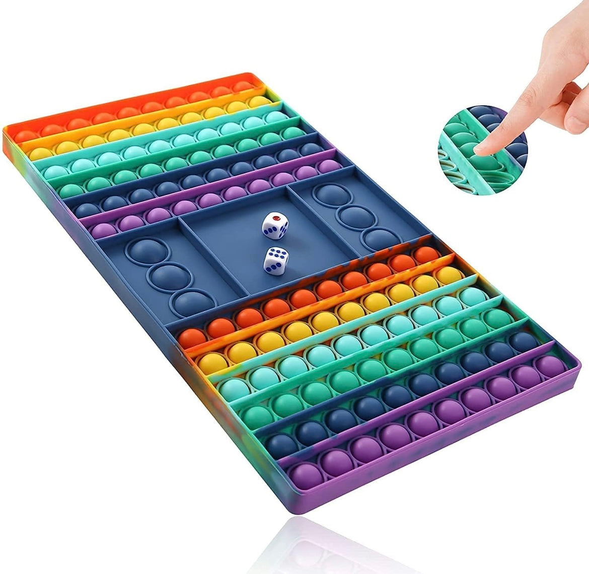 - This rainbow chess board push bubble dice game is a nice interactive fidget game board with 126 bubbles popper and 2 dices.