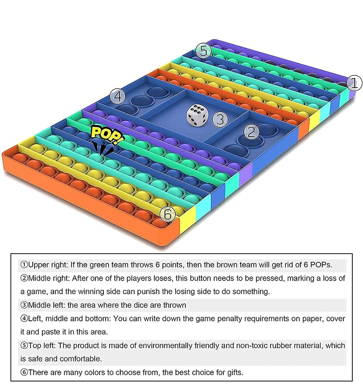 - This Big popit Ludo type pop up game is fun for the whole family. Just press the push bubble popper fidget sensory toys and they will make a slight sound. According to the number of dice rolled by the opponent, the player takes turns to press the pop, and whoever pushes last one will lose.