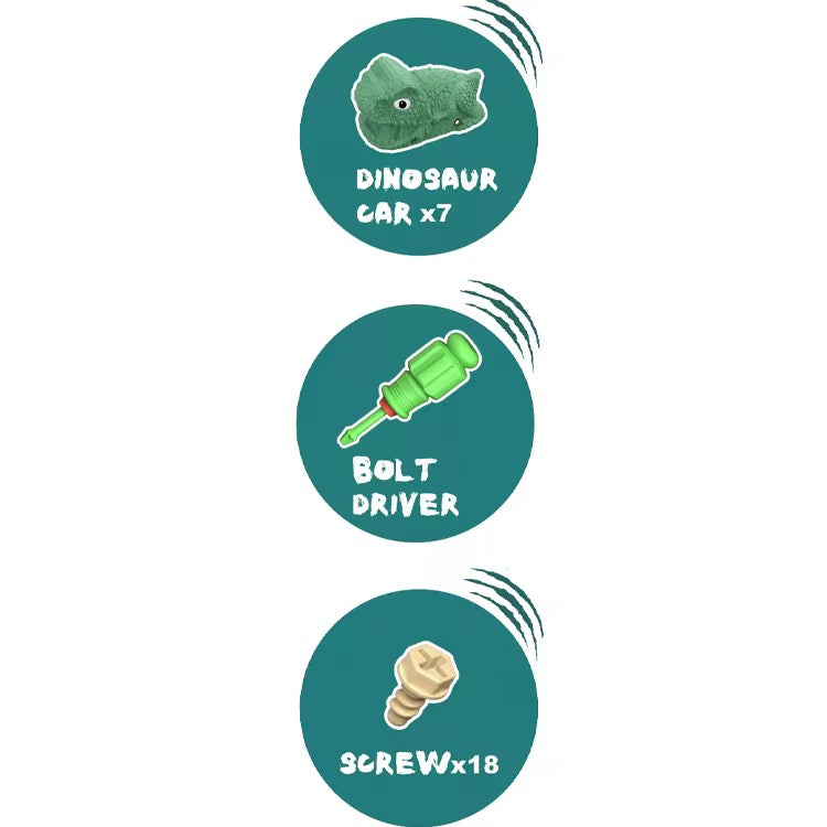 - This Toy garage Includes 7 small dino cars ,1 Plastic screwdriver ,18 Plastic screws,45 other accessories which completes the whole toy. IT Requires 3 AA batteries (not included. The spiral track around the parking lot allows cars to slide quickly from top to bottom and can accommodate more than a dozen vehicles.Real-world scene simulation can help young children better understand the world around them and provide the best way for parent-child interaction.
